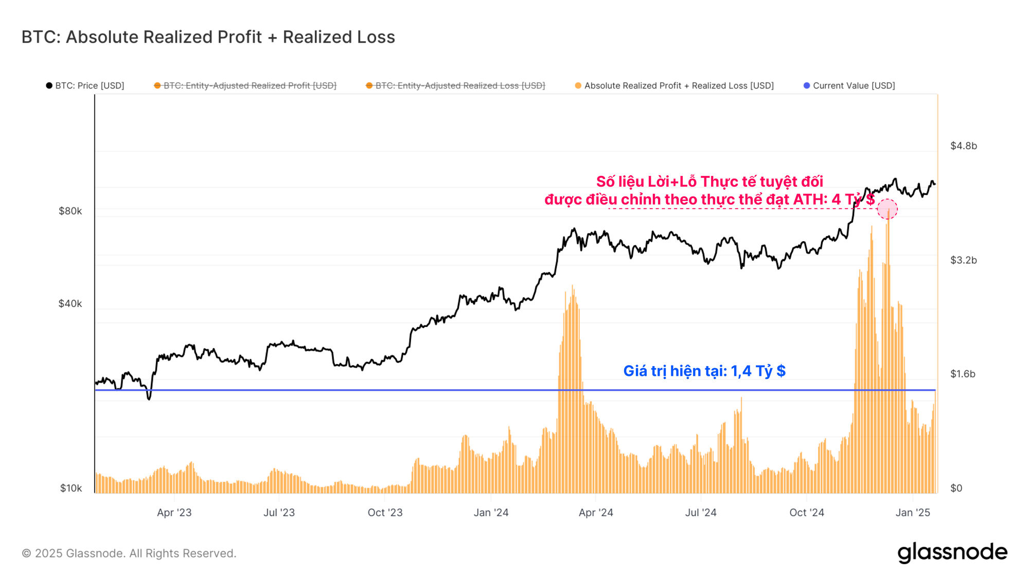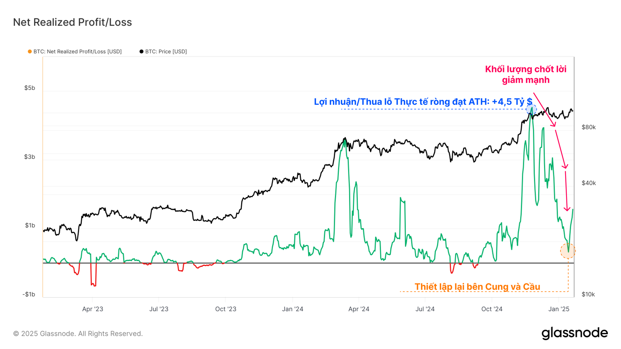 Khi tính tổng lợi nhuận và thua lỗ thực tế, chúng tôi có thể thấy số liệu kết hợp này đã chứng kiến sự sụt giảm mạnh mẽ từ mức ATH là 4 tỷ USD xuống còn 1,4 tỷ USD. Mặc dù đã giảm -65%, giá trị hiện tại vẫn ở mức cao theo góc nhìn lịch sử, điều này làm nổi bật quy mô của nhu cầu hàng ngày, đã giúp hấp thụ nguồn vốn này trong điều kiện thị trường tăng giá.
