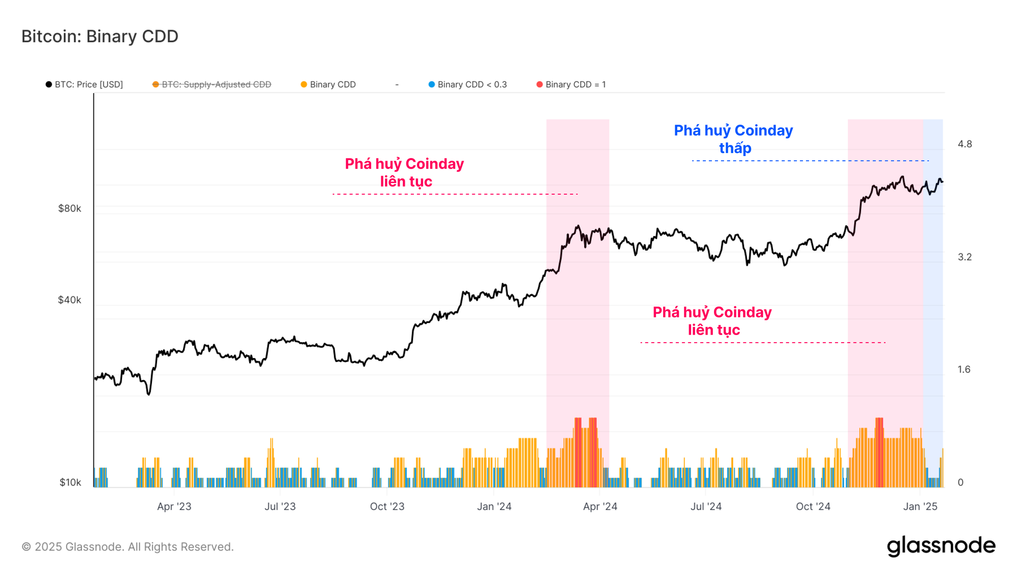 Công cụ đầu tiên chúng tôi có thể sử dụng để mô tả tốt hơn về áp lực phân phối của nhà đầu tư là Binary CDD. Số liệu này theo dõi sự chi tiêu “thời gian nắm giữ” trên toàn thị trường, theo dõi thời điểm những người nắm giữ nguồn cung cũ giao dịch với khối lượng ngày càng tăng.