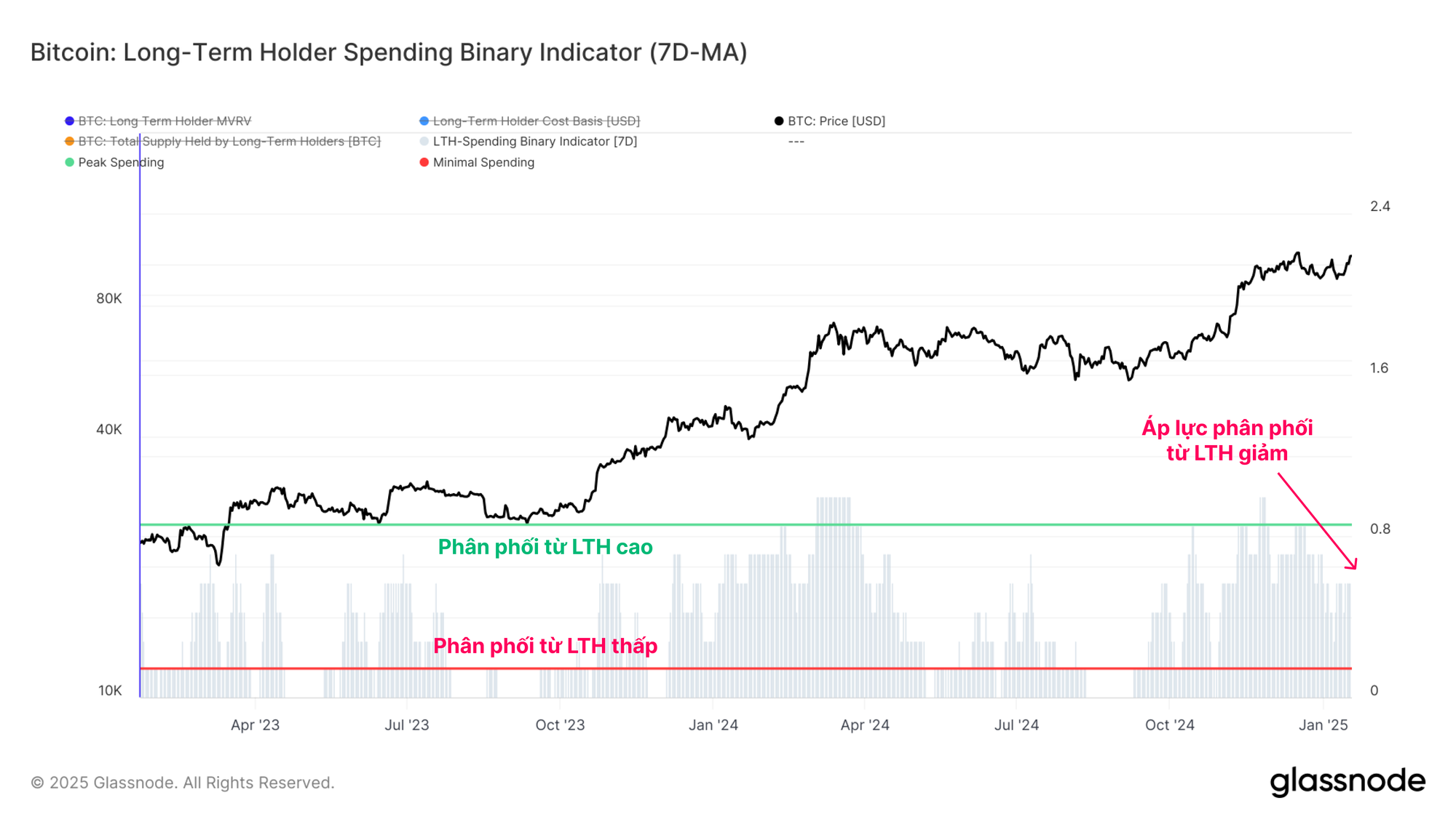Chỉ báo Long-Term Holder (LTH) Binary Spending là một số liệu khác mà chúng tôi có thể sử dụng để đánh giá khoảng thời gian có áp lực bán liên tục. Công cụ này tập trung cụ thể vào các nhà đầu tư dài hạn.