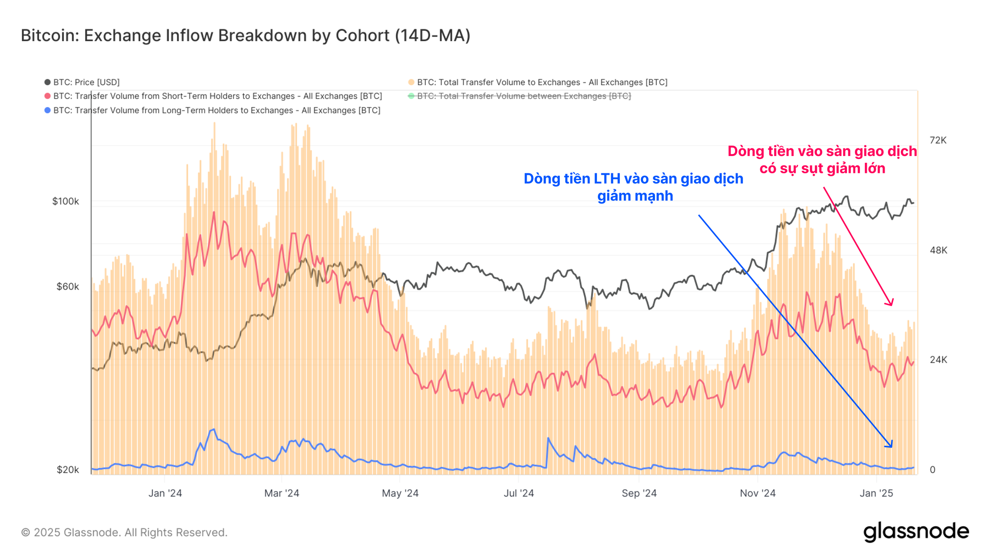Đáng chú ý là khối lượng dòng tiền LTH chảy vào sàn giao dịch đã giảm từ 526,9 triệu USD vào tháng 12 xuống giá trị hiện tại là 92,3 triệu USD, giảm -83% về khối lượng tiền gửi.