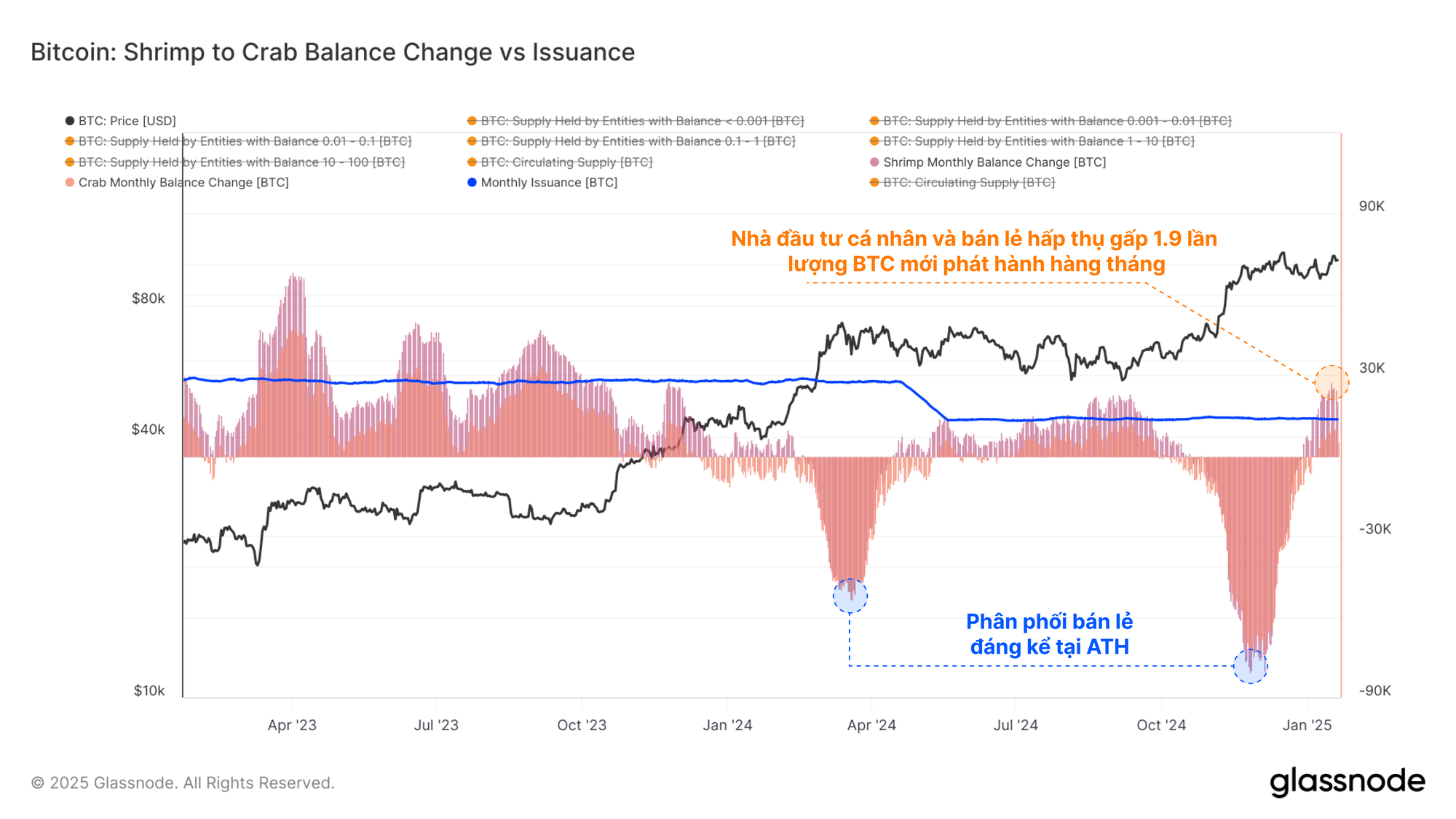 Tập trung vào nhóm Tôm-Cua (nắm giữ <10 BTC) là đại diện cho các nhà đầu tư cá nhân và bán lẻ, chúng tôi nhận thấy nhóm này đã hấp thụ khoảng +25,6k BTC trong tháng qua. So sánh với lượng BTC phát hành mới hàng tháng vào khoảng +13,6k BTC, có thể thấy những người nắm giữ cá nhân và bán lẻ này đã hấp thụ gấp 1,9 lần khối lượng nguồn cung mới được đưa ra thị trường.