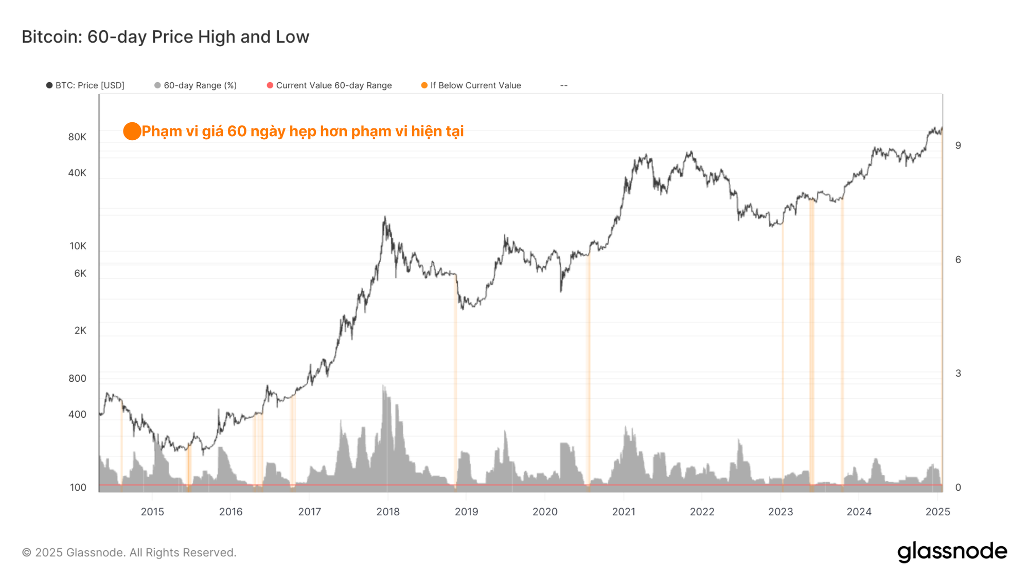 Bằng cách đo phạm vi phần trăm giữa mức giá cao nhất và thấp nhất trong 60 ngày qua, chúng tôi có thể thấy mức độ nén hoặc biến động của thị trường theo thời gian. Biểu đồ bên dưới làm nổi bật các giai đoạn có phạm vi giá 60 ngày hẹp hơn so với phạm vi giao dịch hiện tại. Tất cả các trường hợp này đều xảy ra trước một đợt biến động đáng kể, phần lớn là ở các thị trường tăng giá giai đoạn đầu hoặc trước các đợt đầu hàng giai đoạn cuối trong các chu kỳ giảm giá.