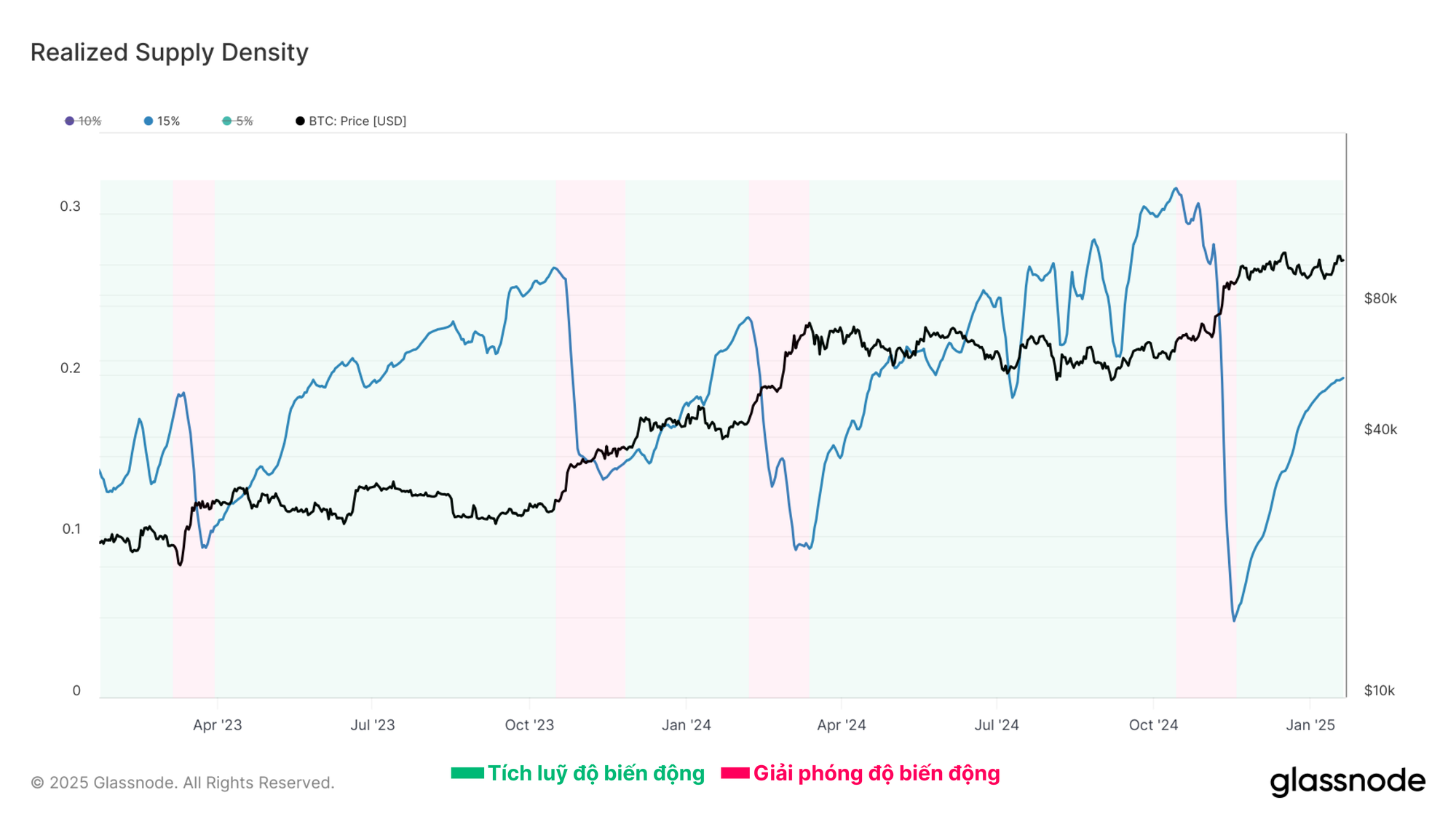 Chỉ số Realized Supply Density định lượng mức độ tập trung của nguồn cung xung quanh giá giao ngay hiện tại trong phạm vi biến động giá ±15%. Khi nguồn cung tập trung dày đặc xung quanh giá giao ngay, những biến động nhỏ về giá có thể ảnh hưởng đáng kể đến lợi nhuận của nhà đầu tư, từ đó có thể khuếch đại sự biến động của thị trường.