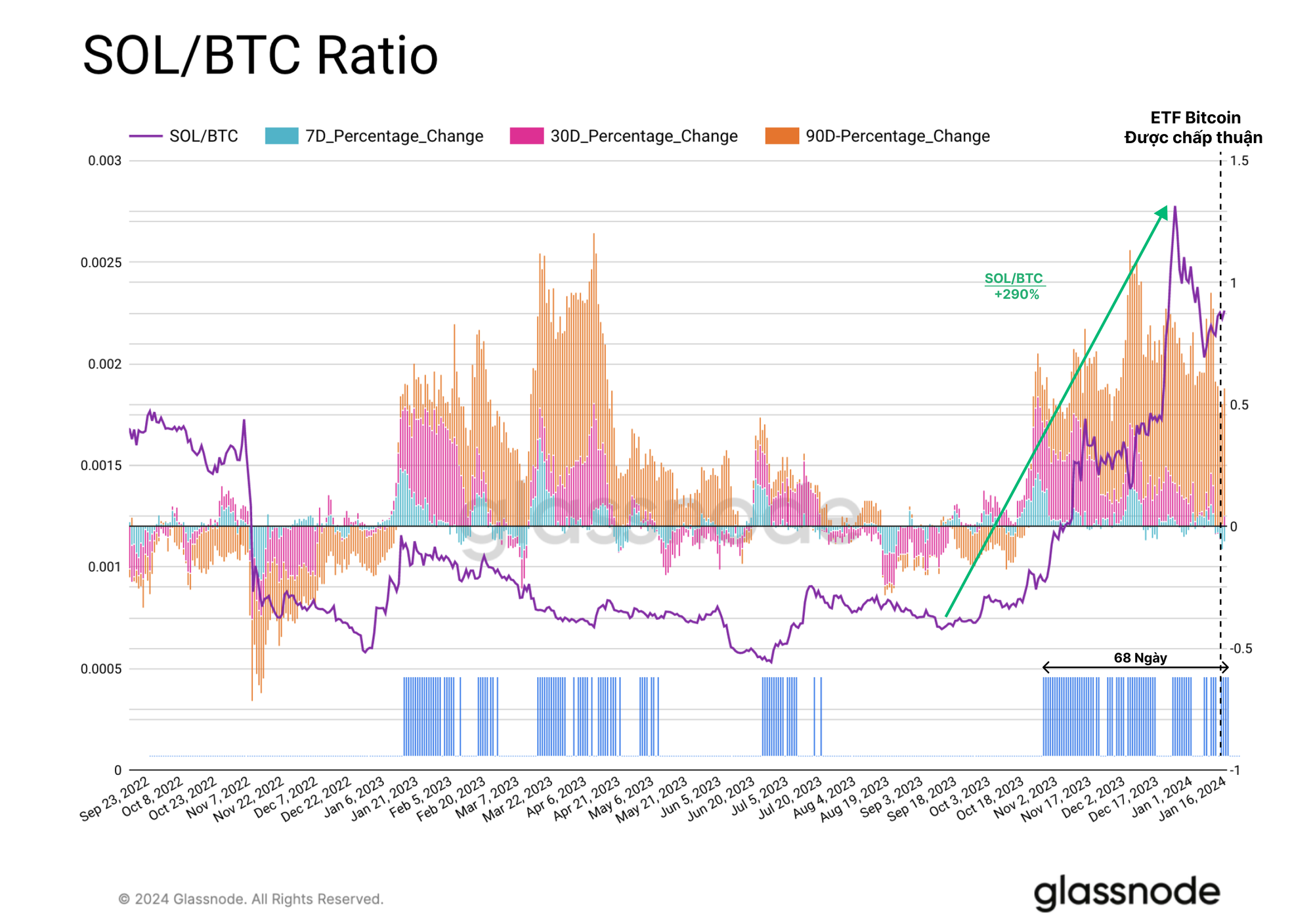 Tỷ lệ SOL/BTC đã tăng 290% kể từ tháng 10 năm 2023 và vượt trội đáng kể so với ETH trong cùng giai đoạn. Điều thú vị là, không giống như ETH, giá của SOL không có bất kỳ sự gia tăng đáng kể nào sau khi ETF Bitcoin được phê duyệt.