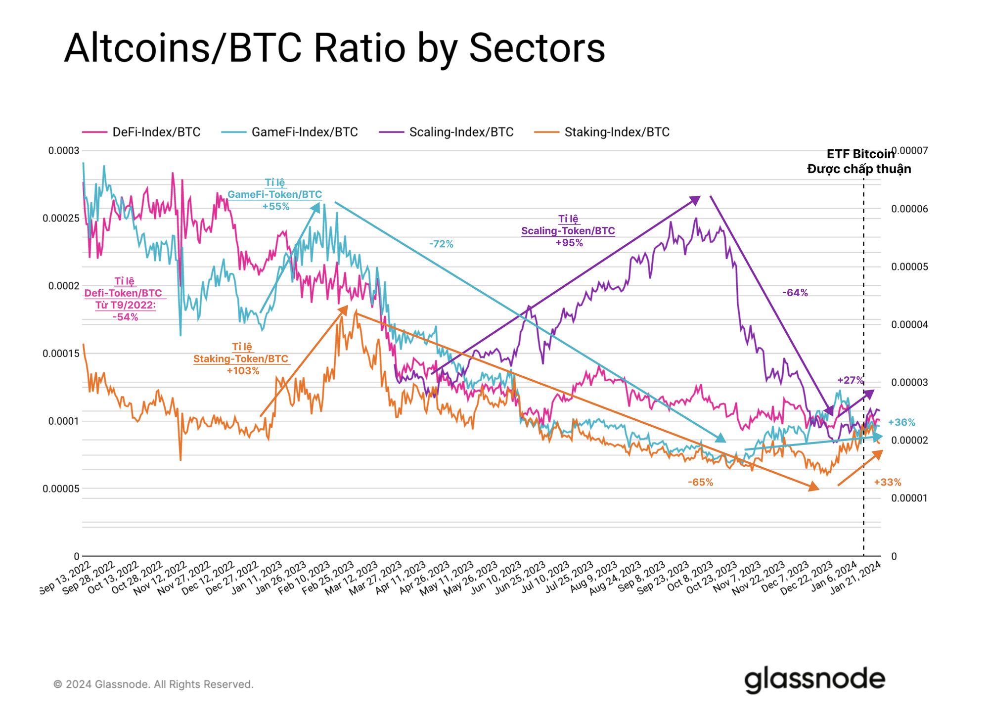 Các Token liên quan đến các giải pháp mở rộng (Scaling) đạt hiệu suất cao nhất vào cuối năm với tỷ lệ Token Scaling/BTC tăng +95% trong quý 2 và quý 3 năm 2023. Điều quan trọng cần lưu ý là token Arbitrum chỉ mới ra mắt vào tháng 3 năm 2023, có thể là điểm kích hoạt cho sự vượt trội này.