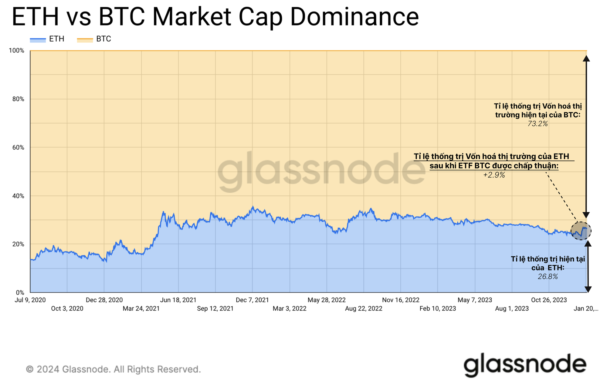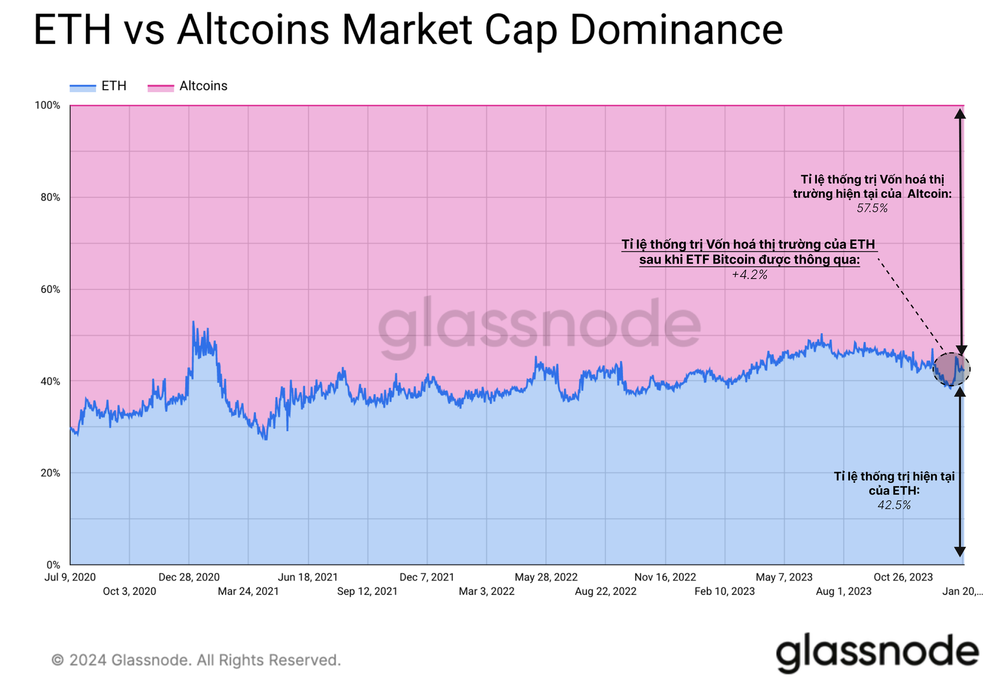 Tuy nhiên, so với ETH, Altcoin không trụ vững được trong những tuần gần đây. ETH thể hiện vượt trội so với các Altcoin nói chung, đạt được +4.2% vị thế thống trị toàn cầu. Điều này khiến ETH trở thành người chiến thắng lớn nhất trong các diễn biến thị trường hậu ETF.