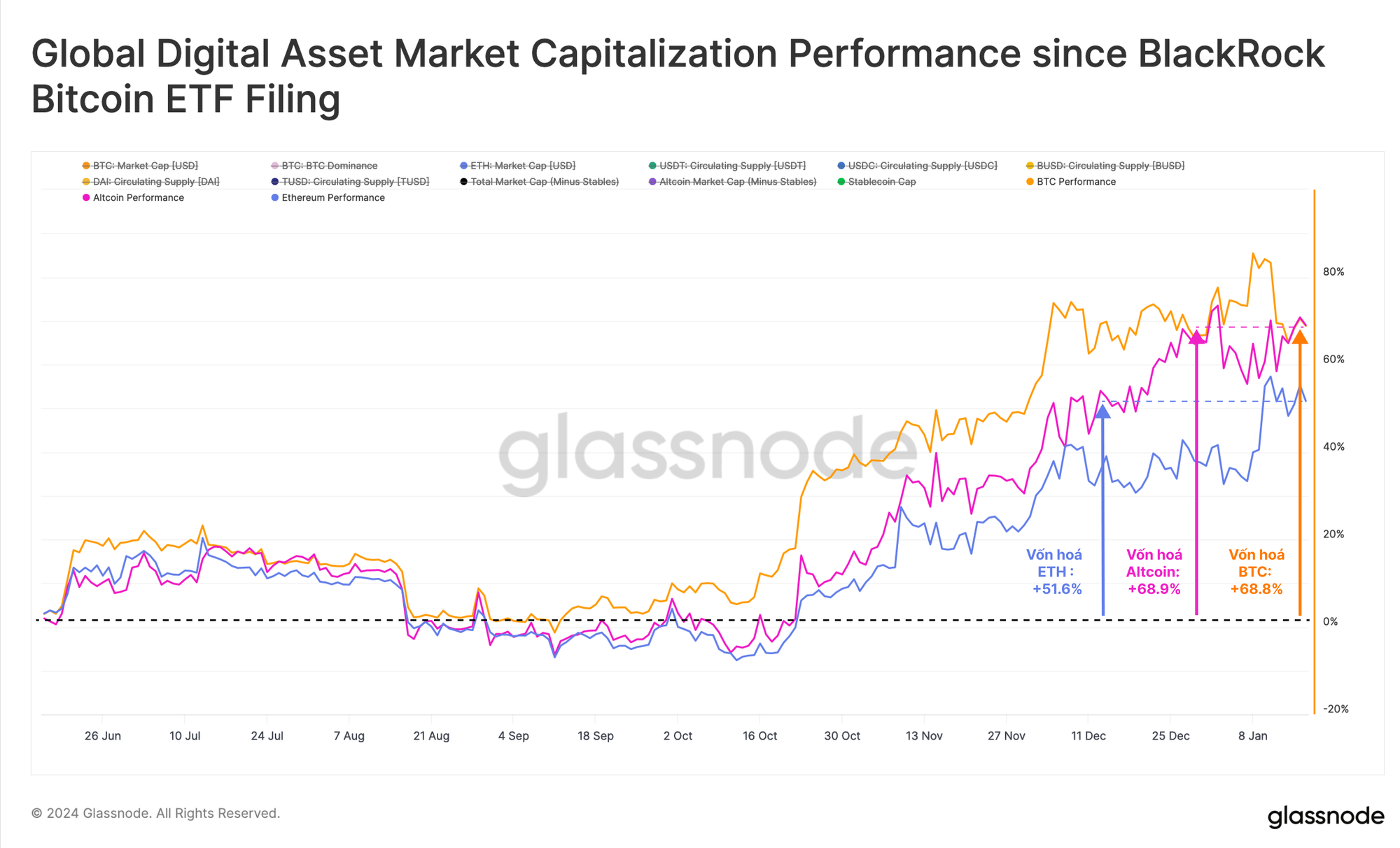 Vốn hóa thị trường của Bitcoin đã tăng +68.8% kể từ khi BlackRock lần đầu nộp đơn đăng ký ETF và tổng Vốn hóa thị trường Altcoin cũng theo đó, tăng +68.9%. Tuy nhiên, Ethereum đã chứng kiến động lực tương đối chậm hơn, hoạt động kém hơn -17% so với thị trường Altcoin còn lại.
