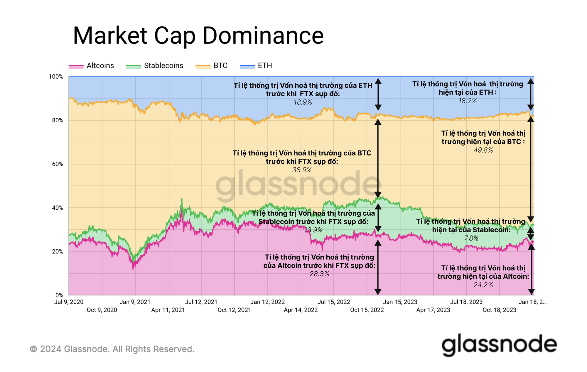 Nhìn chung Bitcoin ngày càng chiếm ưu thế trong vài năm qua. Kể từ khi FTX sụp đổ vào tháng 11 năm 2022, BTC đã tăng mức thống trị vốn hóa thị trường từ 38.9% lên 49.8%.