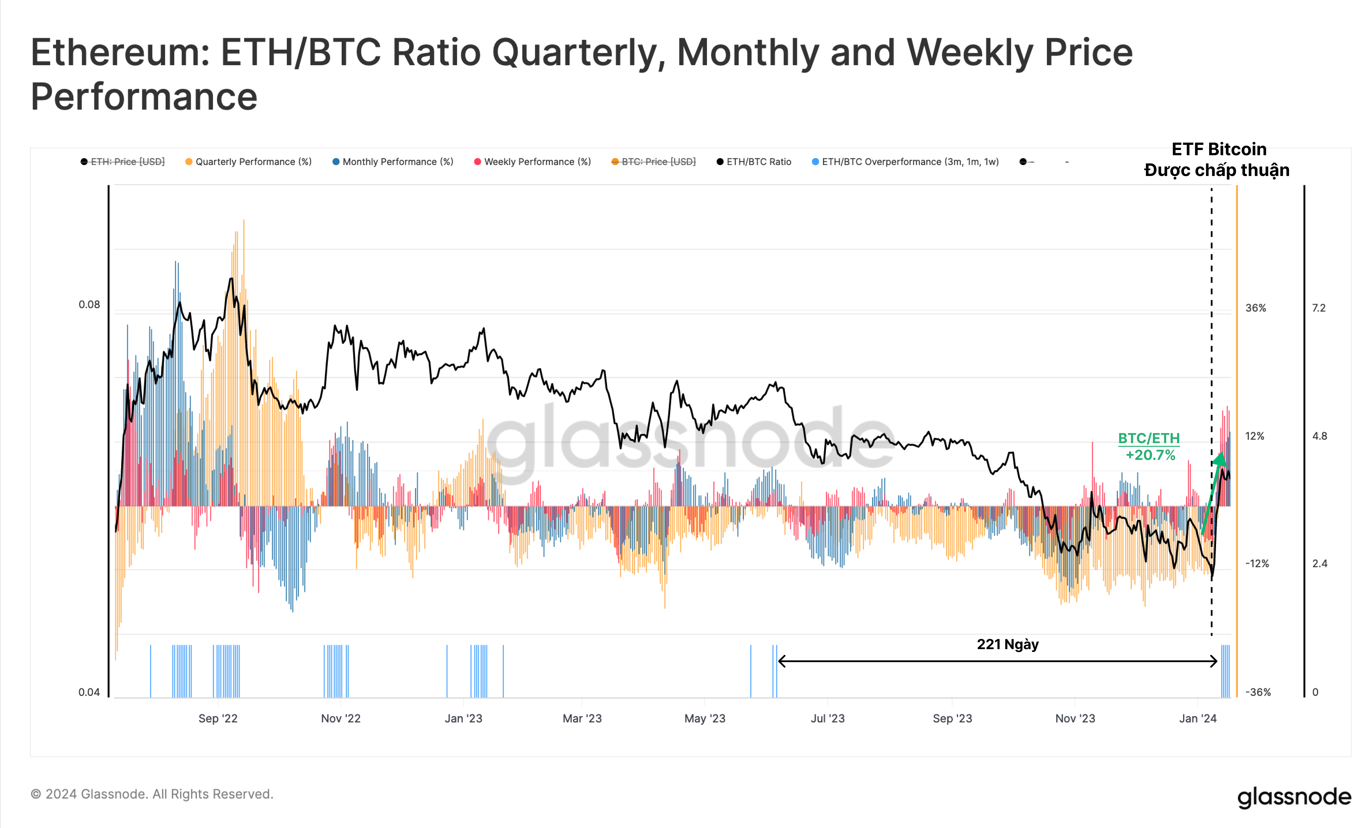 Giá ETH đã tăng hơn +20% so với BTC trong những tuần gần đây, đánh dấu hiệu suất mạnh nhất kể từ cuối năm 2022 trên cơ sở hàng quý, hàng tháng và hàng tuần.