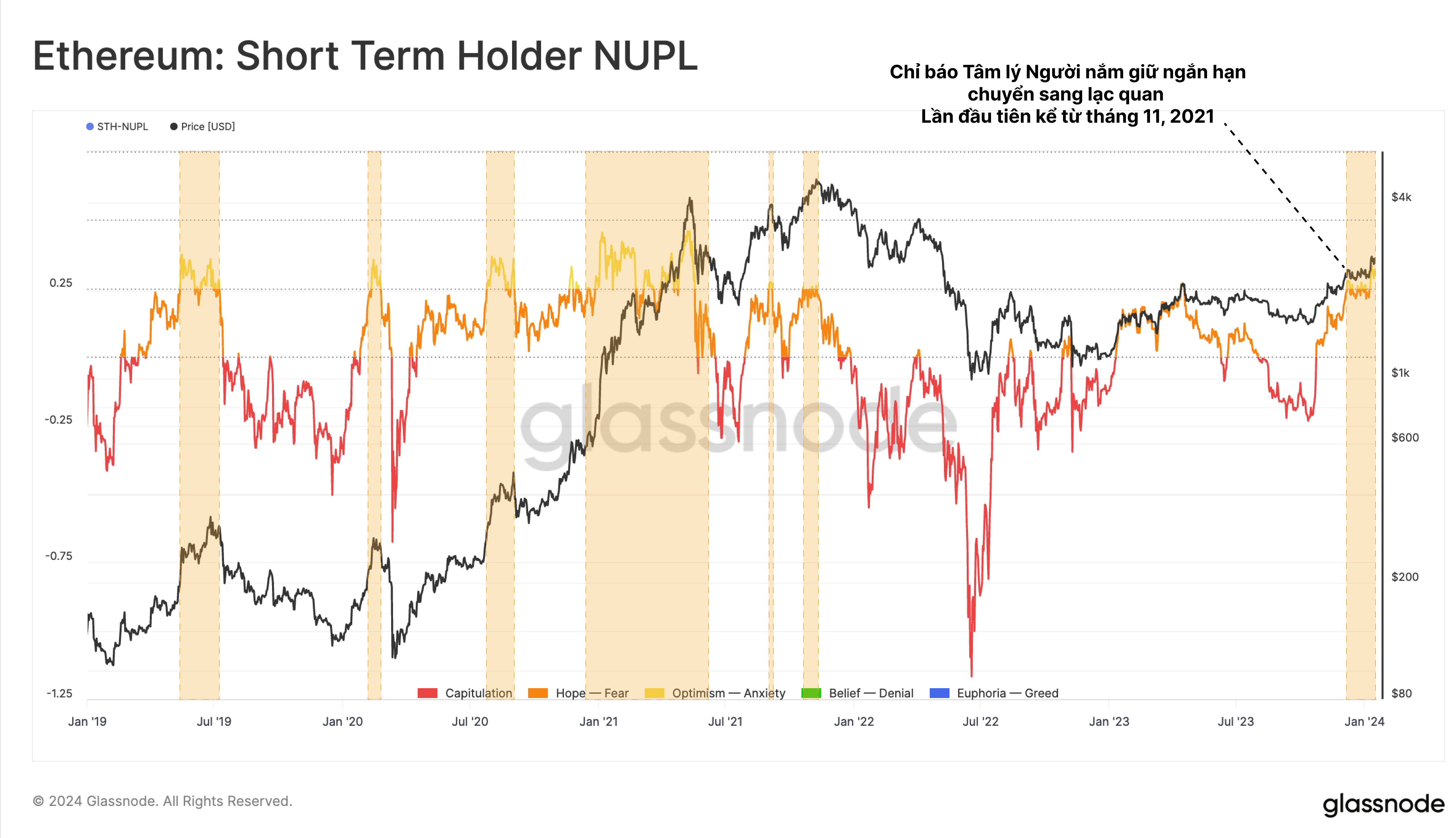 Tâm lý thị trường tích cực đối với ETH được xác nhận bởi một chỉ báo khác: Lãi/lỗ ròng chưa thực hiện (NUPL) của người nắm giữ ngắn hạn. STH-NUPL đã vượt qua mức 0.25 lần đầu tiên kể từ ATH tháng 11 năm 2021.