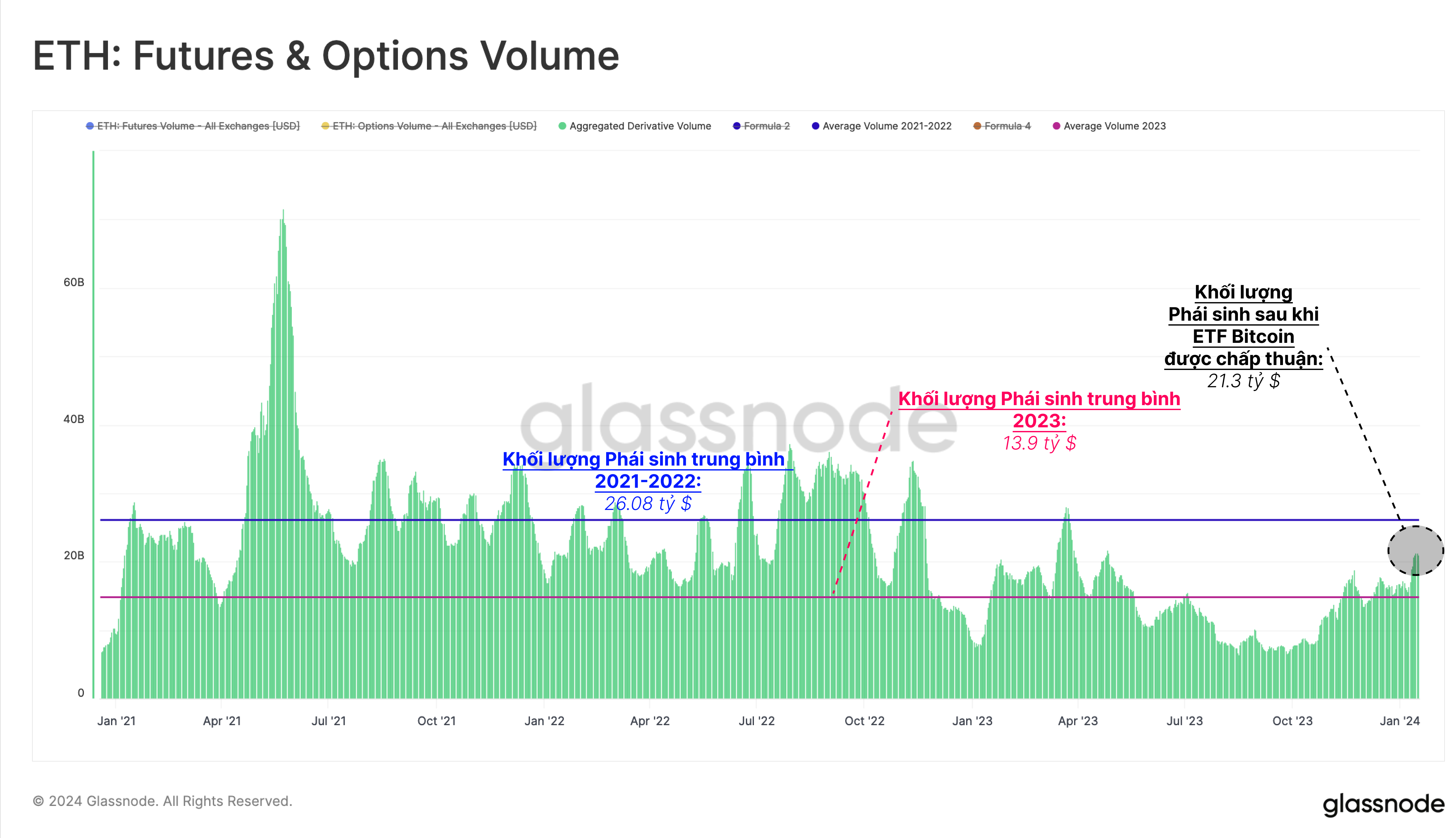 Đợt phục hồi gần đây của Ethereum đáng để chúng tôi kiểm tra các thị trường phái sinh của nó nhằm đánh giá xem các thị trường có đòn bẩy này đang phản ứng như thế nào. Trong những tuần gần đây, có thể thấy khối lượng giao dịch tăng lên đáng kể đối với cả hợp đồng tương lai và quyền chọn. Kết hợp lại, các thị trường ETH có tổng khối lượng giao dịch là 21.3 tỷ USD/ngày, vượt qua khối lượng trung bình của năm 2023 (13.9 tỷ USD), nhưng vẫn còn xa so với các mức điển hình được thấy trong năm 2021 đến 2022.