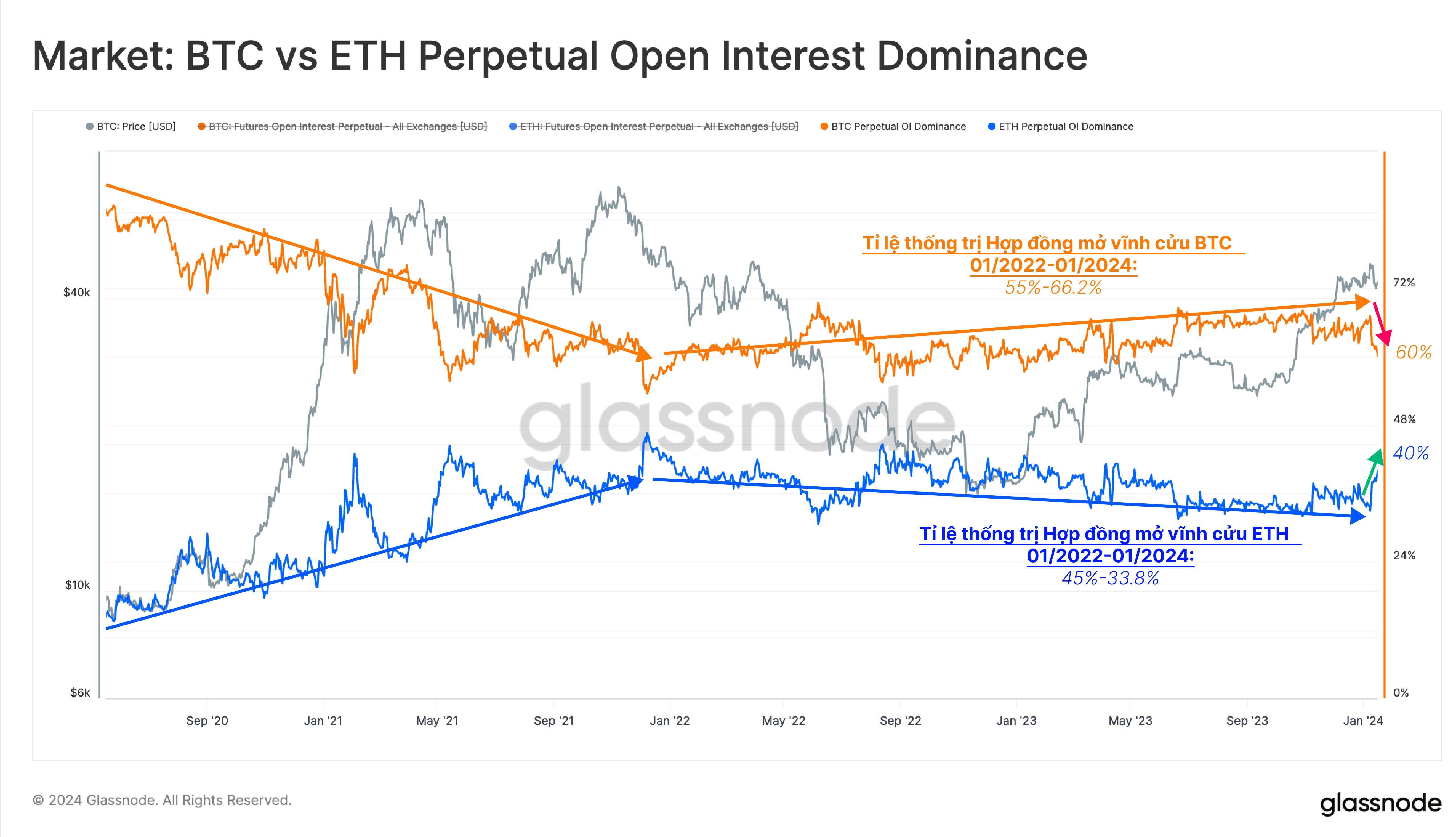 Ngược lại, tỷ lệ thống trị hợp đồng mở ETH giảm từ 45% xuống 33.8% trong khoảng thời gian từ năm 2022 đến năm 2024. Tuy nhiên, sau khi ETF Bitcoin được phê duyệt, ETH đã lấy lại được một số thị phần, với tỷ lệ thống trị của nó tăng trở lại mức ~ 40%.