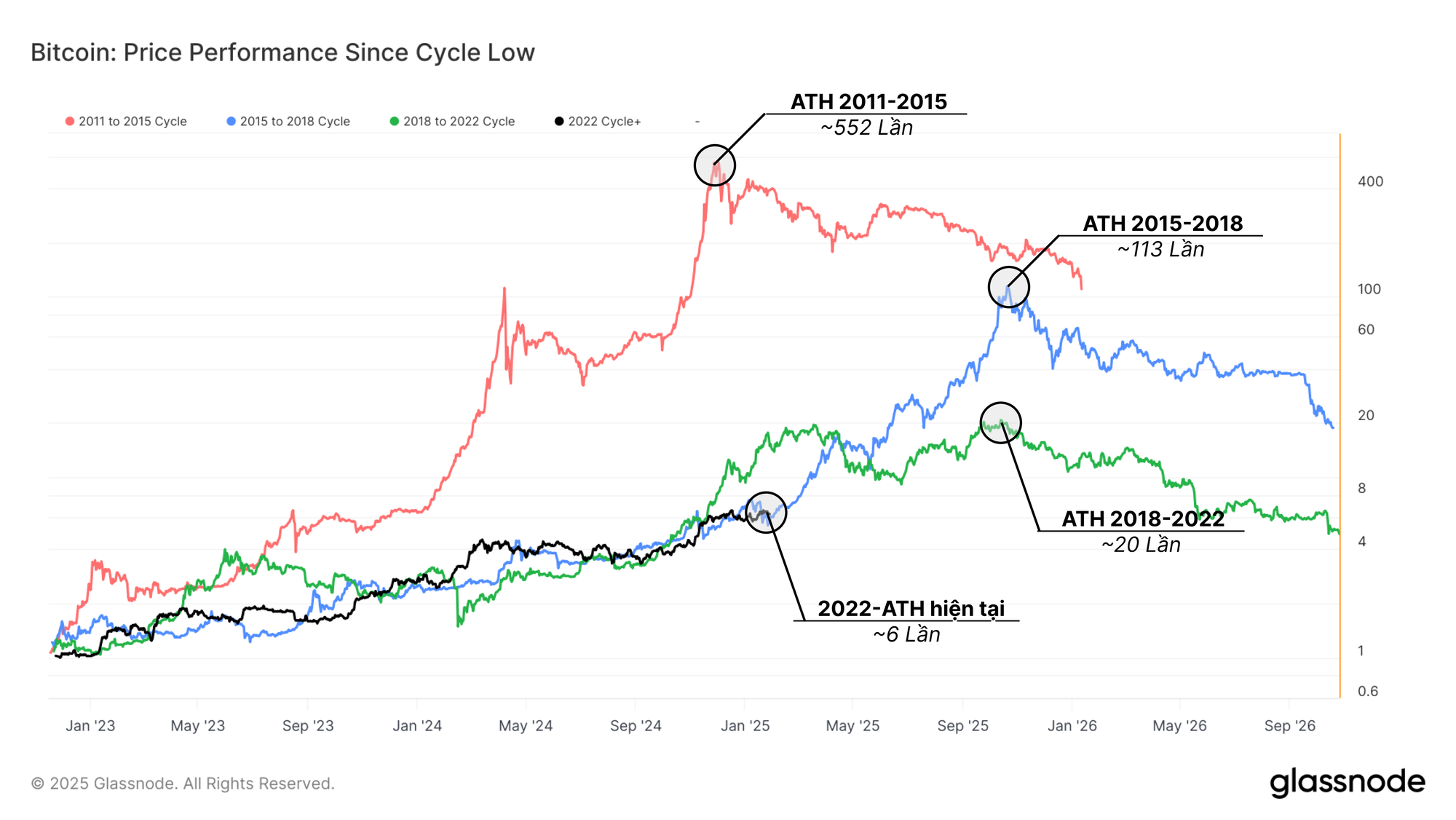 Biểu đồ bên dưới cho thấy chỉ số hiệu suất giá của Bitcoin so với đáy chu kỳ và biểu đồ tiếp theo xem xét các đợt sụt giảm trong các thị trường tăng giá. Thông qua việc đánh giá hai biểu đồ này, một số xu hướng chính xuất hiện: