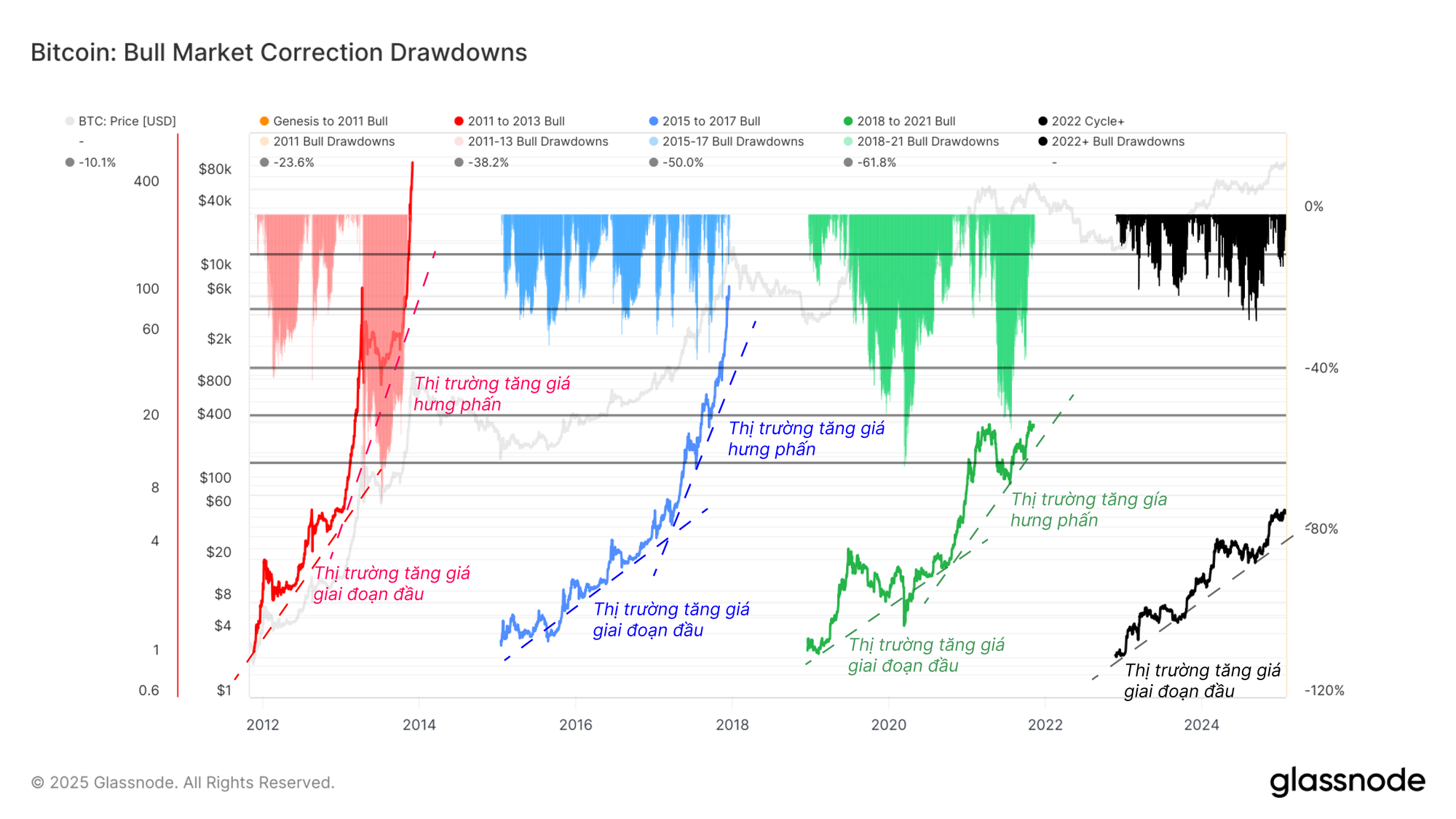 - Quy mô sụt giảm: Các đợt sụt giảm trong chu kỳ hiện tại thường nằm trong mức Fibonacci từ 10,1% đến 23,6% và rất giống với chu kỳ 2015–2017.