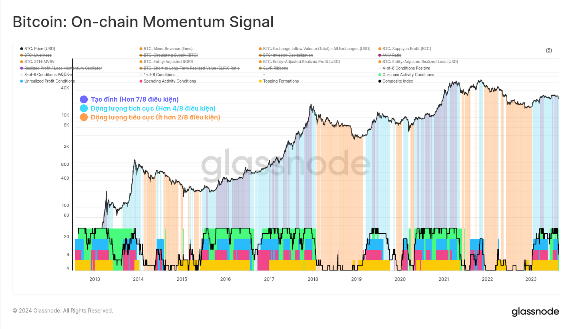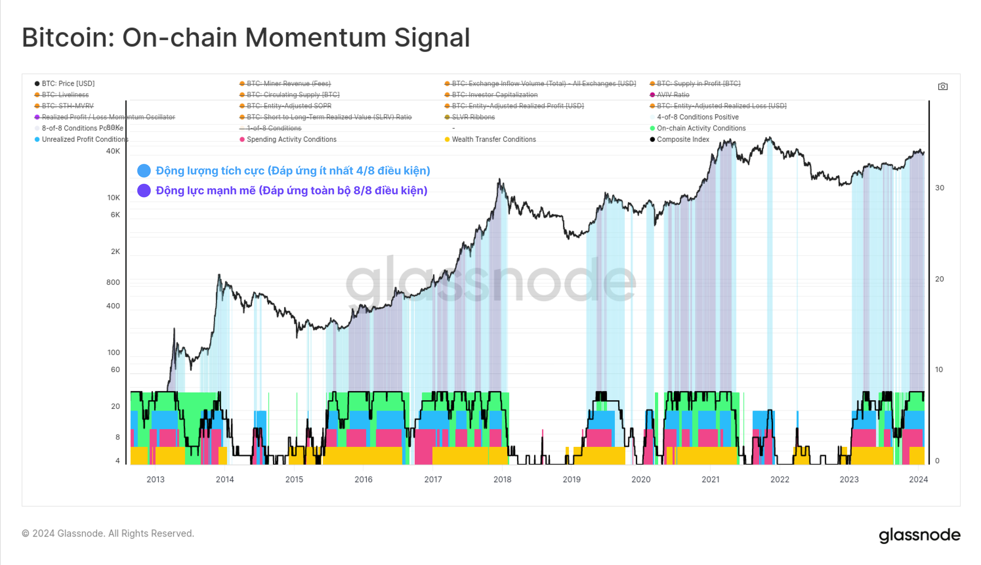 Ở đây, chúng tôi đã tính trọng số đồng đều cho từng thành phần riêng lẻ và áp dụng một điều kiện đơn giản để đánh dấu màu xanh lam khi 4 trong 8 điều kiện được đáp ứng. Điều này trong lịch sử đã xác định các giai đoạn khi thị trường Bitcoin trong xu hướng tăng bền vững. Chúng tôi cũng có thể đánh dấu bằng màu tím khi tất cả tám điều kiện được đáp ứng, biểu thị các giai đoạn có động lượng tích cực cực kỳ mạnh mẽ trên tất cả các phạm trù.