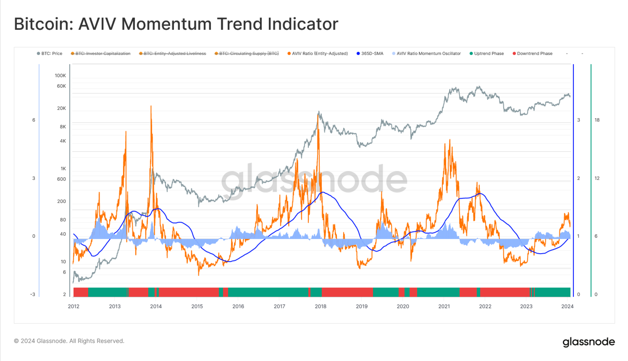 Gần đây hơn, chúng tôi đã phát triển AVIV Ratio cùng với ARK Invest như một phần của Cointime Economics framework. Chúng tôi coi AVIV là một bộ dao động lãi/lỗ chưa thực hiện mang tính đại diện hơn cho các nhà đầu tư tích cực. Từ đó, chúng tôi có thể xác định các bước ngoặt của thị trường: