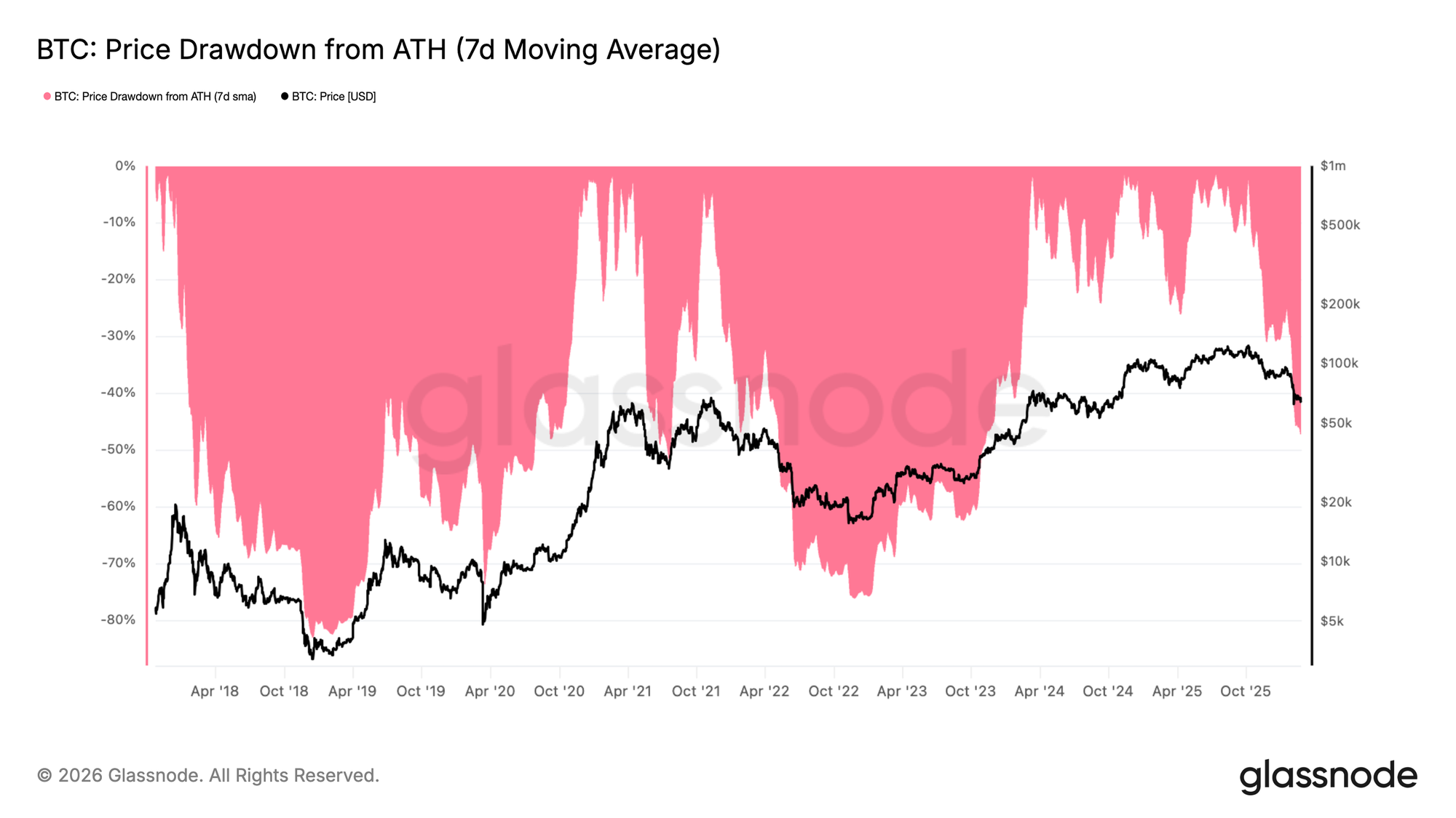 Từ một góc độ chu kỳ rộng hơn, mức giảm trung bình động 7 ngày từ ATH hiện đang ở mức 47,3%, tương đương với giai đoạn đi ngang vào đầu tháng 5 năm 2022 trước khi đà giảm tiếp tục mở rộng. Các dữ liệu tương đồng trong lịch sử cho thấy rằng, tại những độ sâu sụt giảm tương tự, thời gian thường đóng vai trò là lực cản chứ không phải là lực đẩy cho sự tiếp diễn của xu hướng tăng. Việc giá bị nén kéo dài ở các mức này làm tăng xác suất các tổ chức sử dụng đòn bẩy hoặc có cấu trúc tài chính yếu kém phải đối mặt với áp lực ngày càng lớn lên bảng cân đối kế toán của họ.