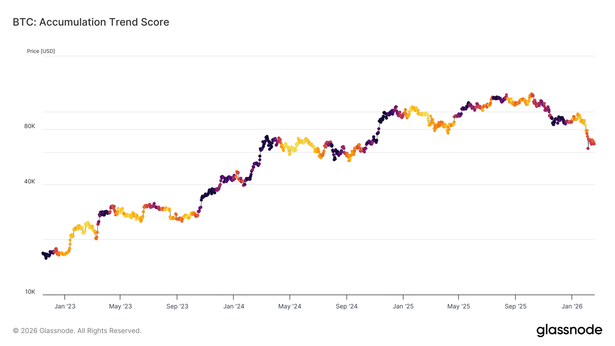 Điểm xu hướng tích lũy cung cấp một thước đo hữu ích cho hành vi này, bằng cách đo lường những thay đổi số dư tương đối trên các nhóm ví khác nhau, đồng thời gán trọng số lớn hơn cho các thực thể lớn. Kể từ ngày 5 tháng 2, Điểm xu hướng tích lũy vẫn bị kìm hãm ở mức dưới 0,5, báo hiệu sự thiếu vắng các hoạt động tích luỹ quyết liệt, đặc biệt là từ những người nắm giữ lớn.