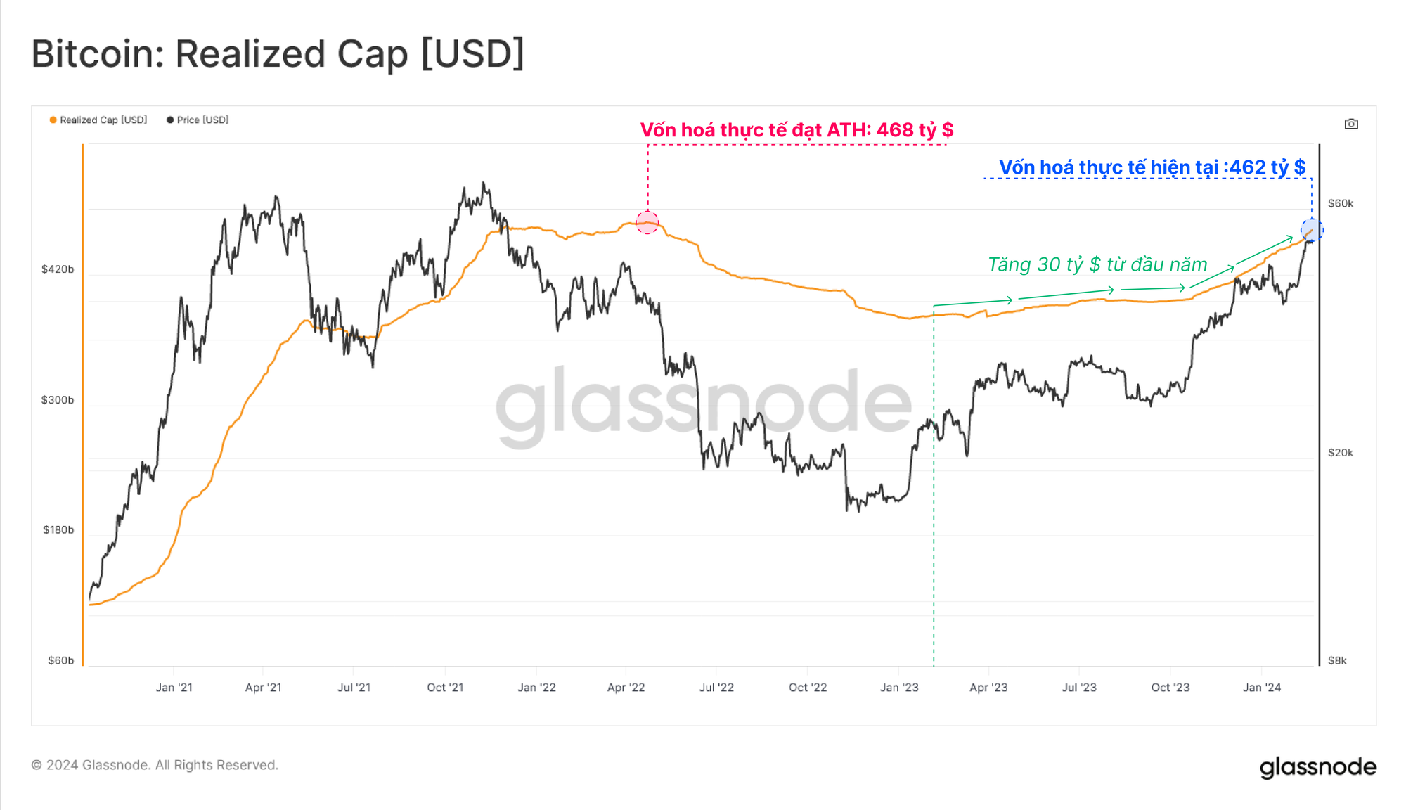 - Quá trình Bitcoin phục hồi sắp hoàn tất khi vốn tiếp tục đổ vào loại tài sản này, đẩy Vốn hóa thực tế lên 460 tỷ USD, chỉ kém 3% so với ATH.