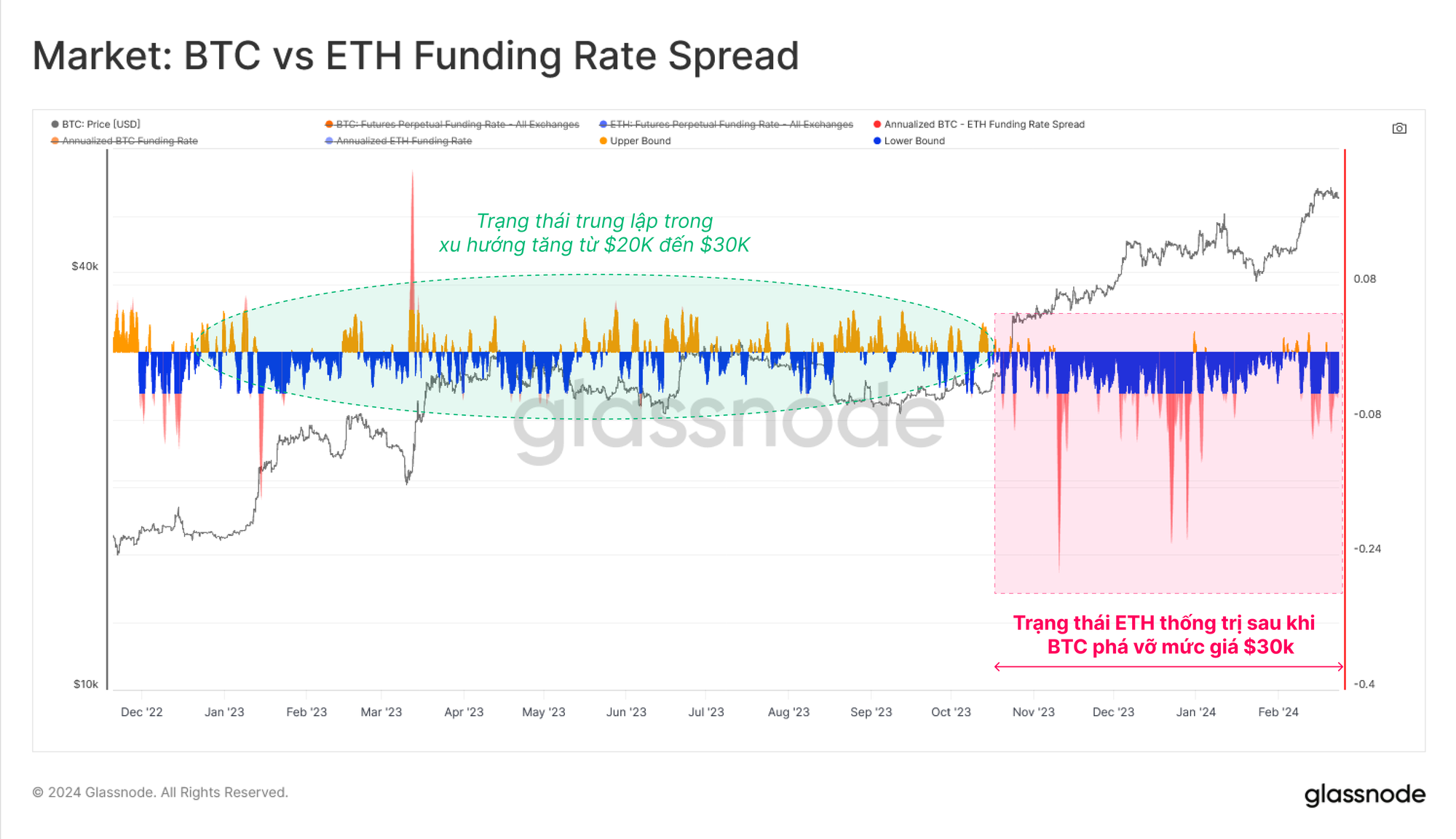 Khoảng cách funding rate giữa BTC và ETH cũng ngày càng mở rộng. Trước tháng 10 năm 2023, có thể quan sát thấy một chế độ tương đối trung tính, trong đó mức chênh lệch dao động giữa trạng thái dương và âm.