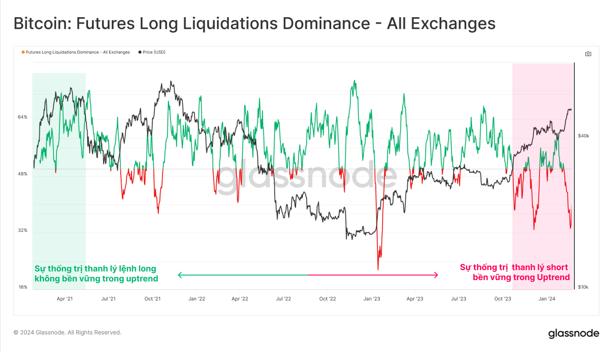 Điều này đã dẫn đến sự tăng trưởng đáng kể về tổng khối lượng thanh lý bên bán trong 30 ngày qua, với hơn 465 triệu USD ở các vị thế đóng. Biểu đồ bên dưới nêu bật các giai đoạn trong đó khối lượng thanh lý vị thế bán khống vượt quá vị thế mua, nhiều giai đoạn trong số đó phù hợp với xu hướng tăng mạnh được thúc đẩy bởi các đợt bán non.