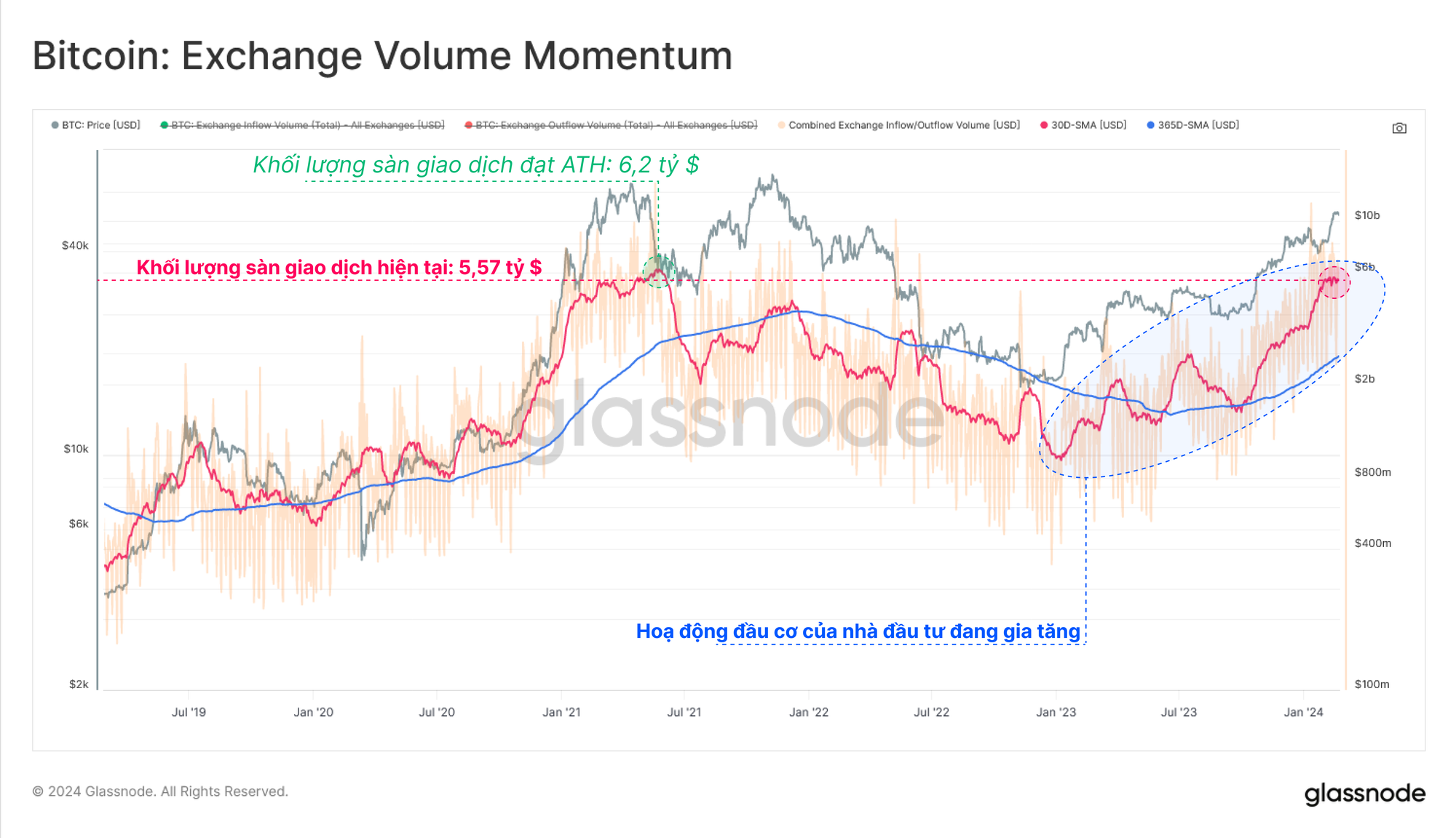 - Khối lượng dòng tiền vào sàn giao dịch gần đạt mức cao nhất mọi thời đại, trong đó phần lớn là những người nắm giữ ngắn hạn. Điều này cho thấy nhu cầu tương đối lớn đối với hoạt động đầu cơ và giao dịch.