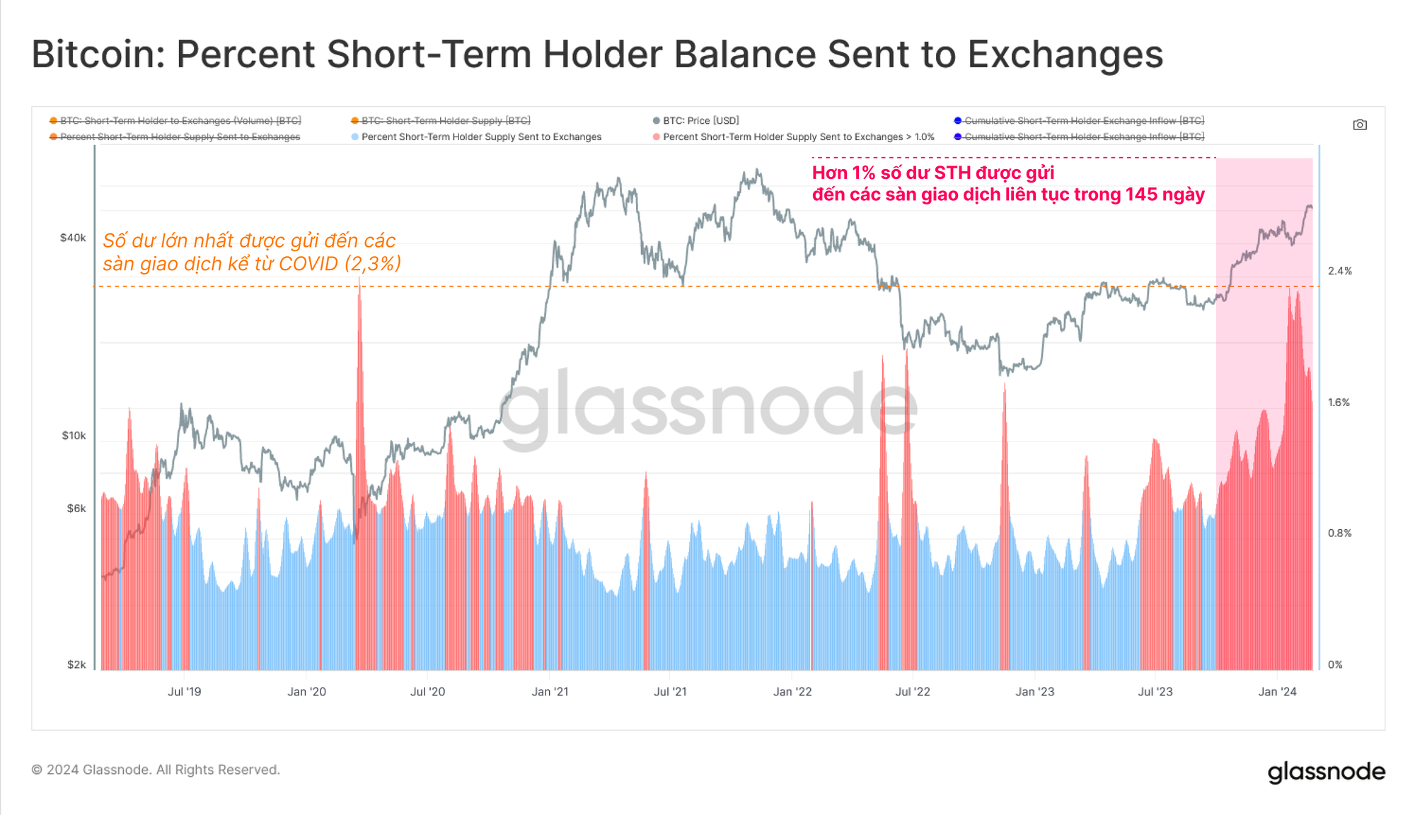 Có thể tìm thấy sự hợp lưu hơn nữa bằng cách đánh giá tỷ lệ phần trăm của số dư STH tổng thể được gửi tới các sàn giao dịch. Kể từ tháng 10 năm 2023, nhóm STH đã gửi hơn 1% nguồn cung của họ mỗi ngày, đạt đỉnh 2,36% trong đợt đầu cơ ETF Bitcoin gần đây. Đây là khoản tiền gửi tương đối lớn nhất kể từ đợt bán tháo vào tháng 3 năm 2020.