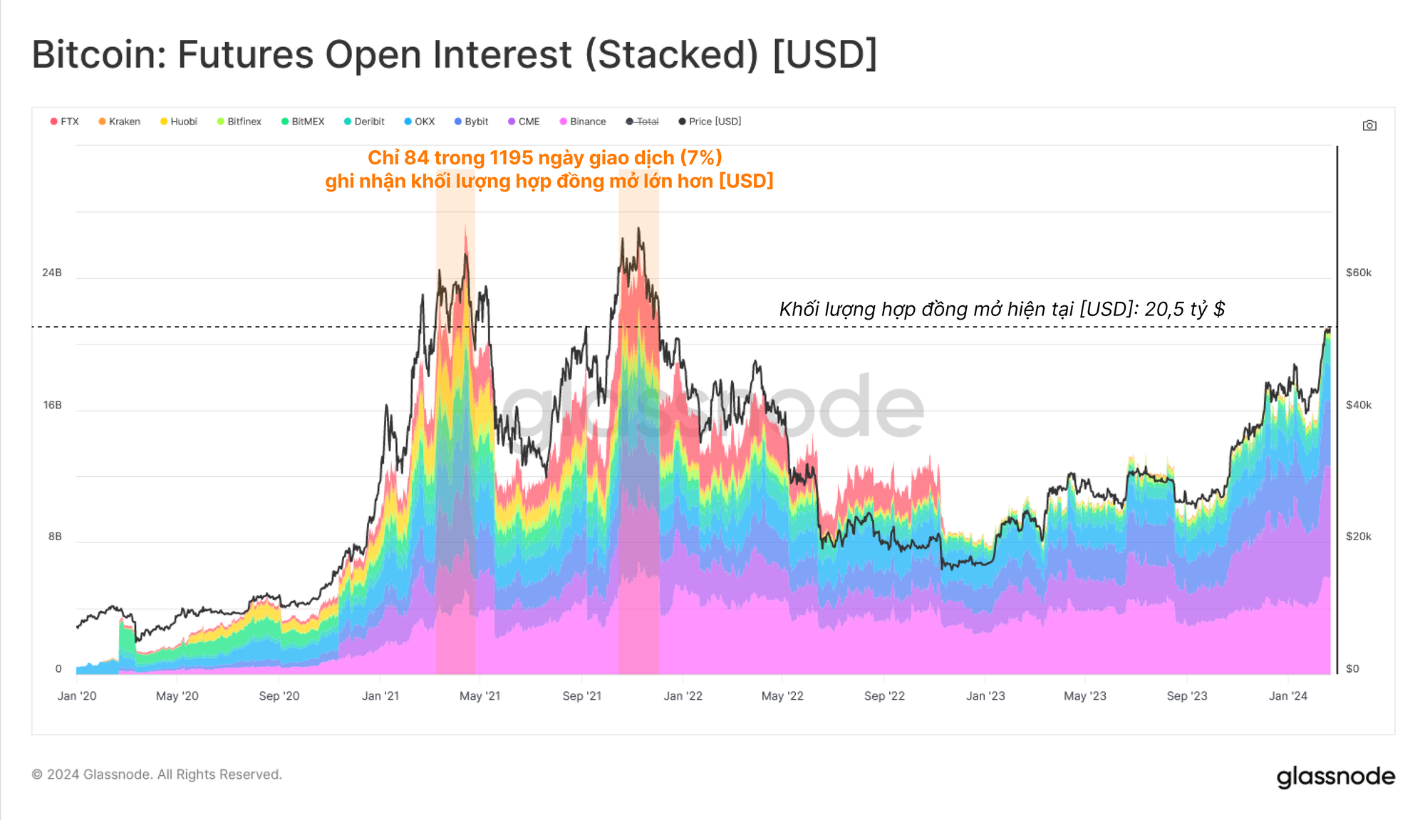 Giá trị theo USD của các hợp đồng mở tương lai đang tiến gần đến các mức cao nhất được thấy trong giai đoạn hưng phấn nhất năm 2021.