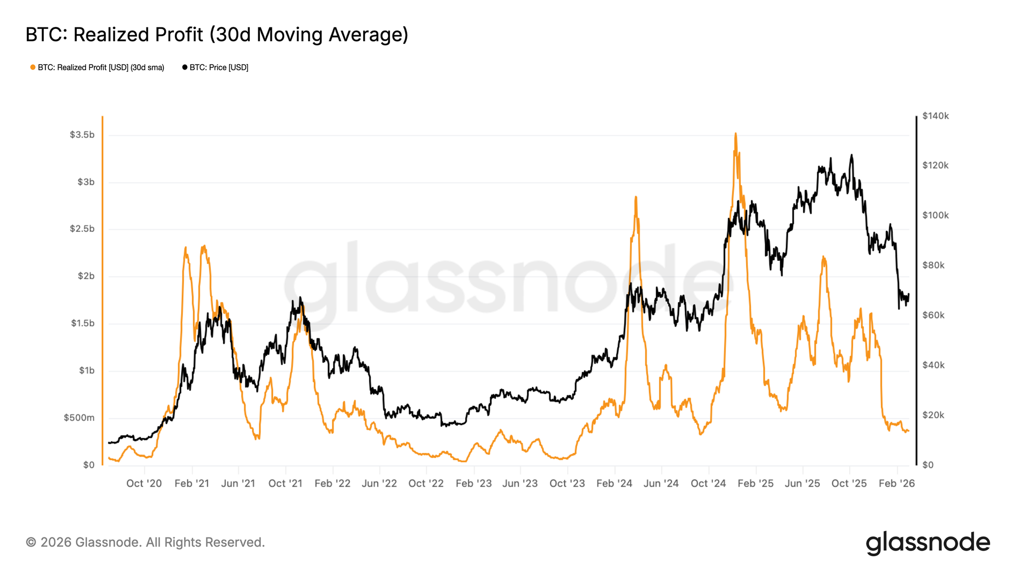 Kể từ đầu tháng 2, Bitcoin đã liên tiếp thất bại trong việc ghi nhận mức giá đóng cửa hàng tuần trên $70k, khiến vùng giá này trở thành một mức kháng cự ngắn hạn có ý nghĩa quan trọng. Để đánh giá xem việc giá bị từ chối ở vùng này có phản ánh sự suy yếu thực sự của nguồn cầu hay không, chúng ta sẽ xem xét Đường trung bình động 30 ngày của Lợi nhuận thực tế. Đây là một thước đo tổng hợp mức lợi nhuận tính bằng USD được chốt bởi các nhà đầu tư on-chain ngay tại thời điểm các đồng coin được chi tiêu, số liệu này cũng đã được làm mượt để lọc bỏ các tín hiệu nhiễu ngắn hạn.