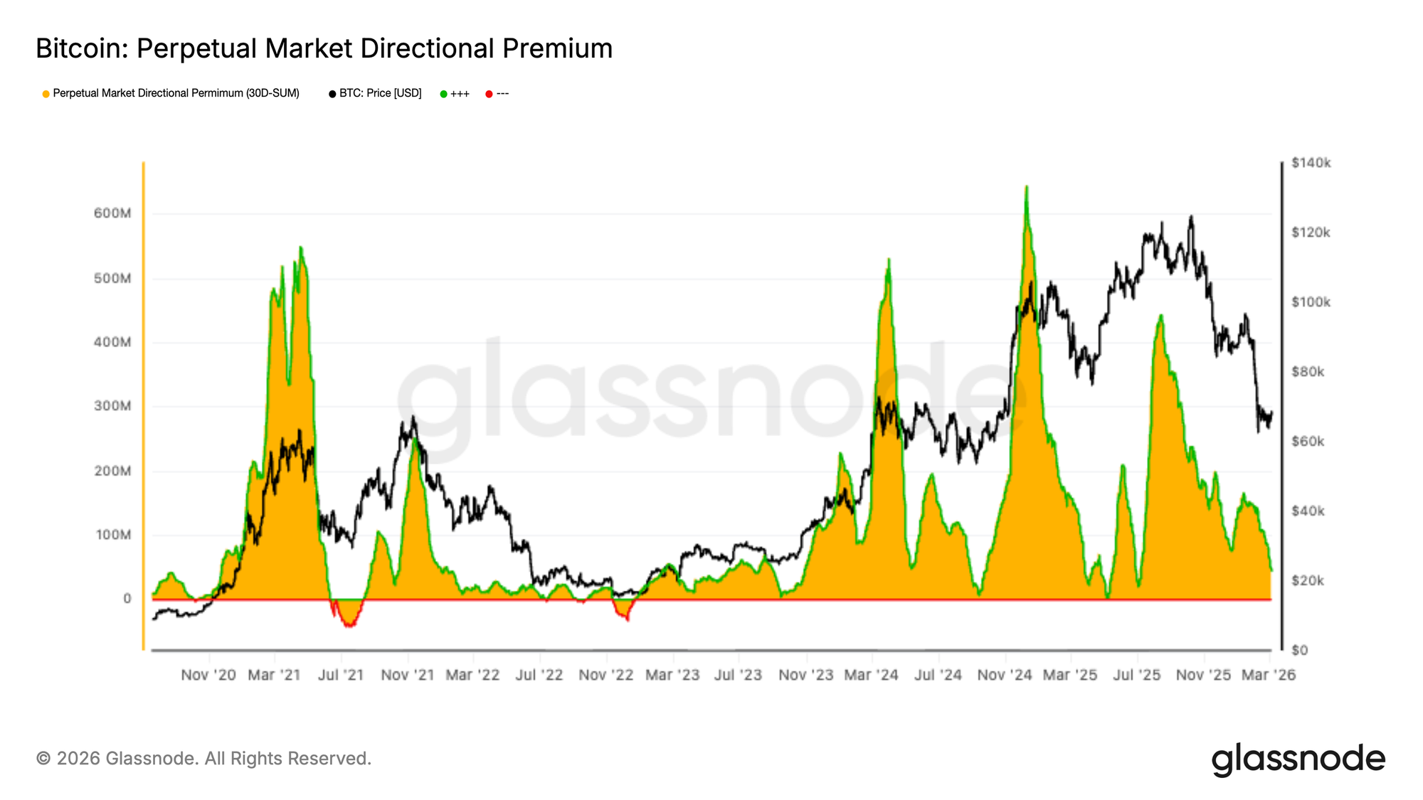 Phí chênh lệch định hướng thị trường tương lai vĩnh cửu tiếp tục xu hướng giảm, phản ánh sự sụt giảm kéo dài của các vị thế kỳ vọng giá tăng trên khắp các thị trường hợp đồng tương lai vĩnh cửu. Chỉ số này đã giảm đều đặn trong những tuần gần đây khi đòn bẩy và niềm tin vào xu hướng thị trường đã hạ nhiệt cùng với đợt điều chỉnh giảm của toàn thị trường.