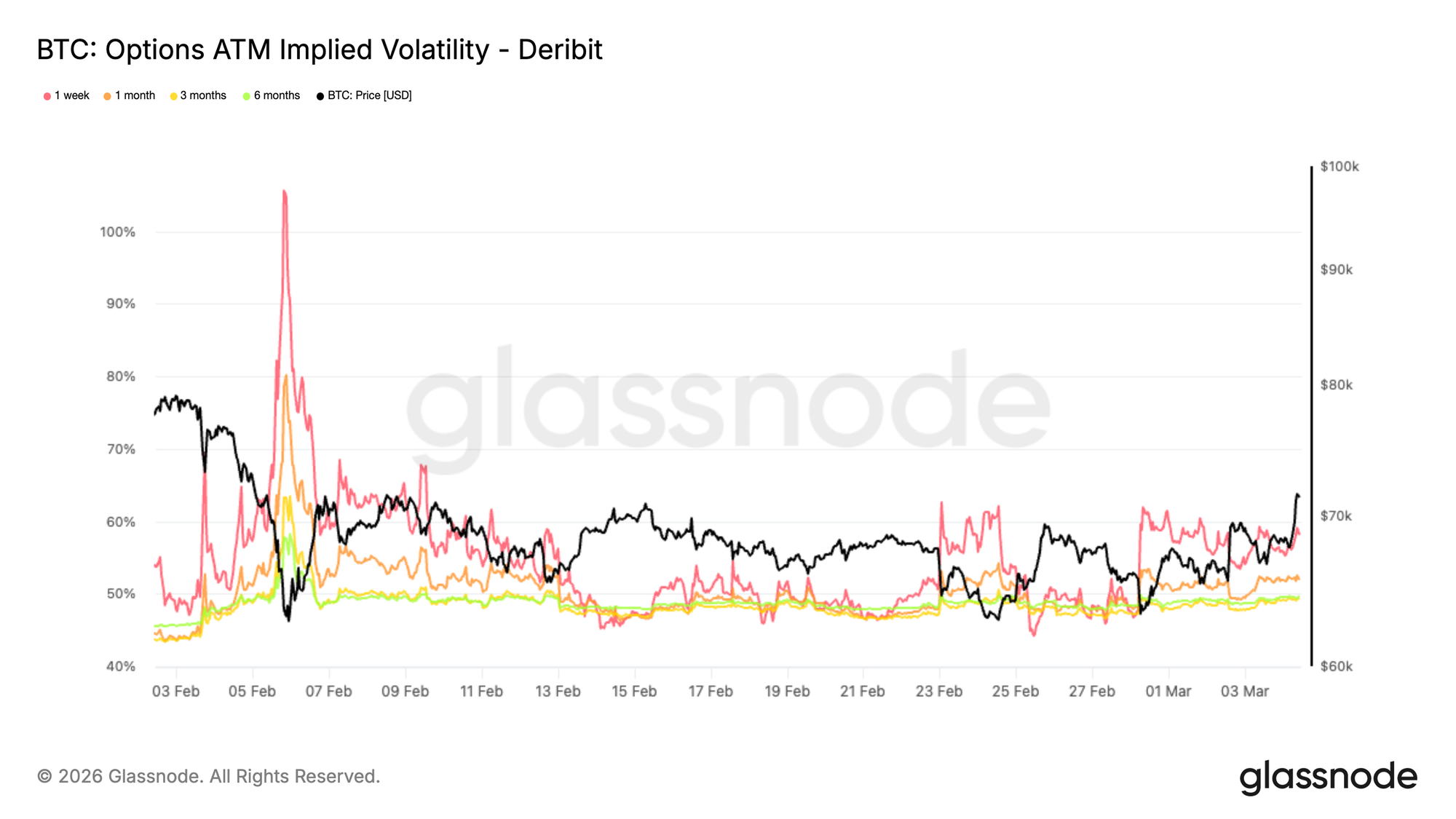 Biến động ngụ ý (IV) tiếp tục thu hẹp sau đợt tăng vọt được ghi nhận vào đầu tháng 2. Xuyên suốt các kỳ hạn chính, IV của các hợp đồng đang hòa vốn đã giảm đáng kể, cho thấy các nhà giao dịch không còn định giá một cách gay gắt cho các rủi ro cực đoan.