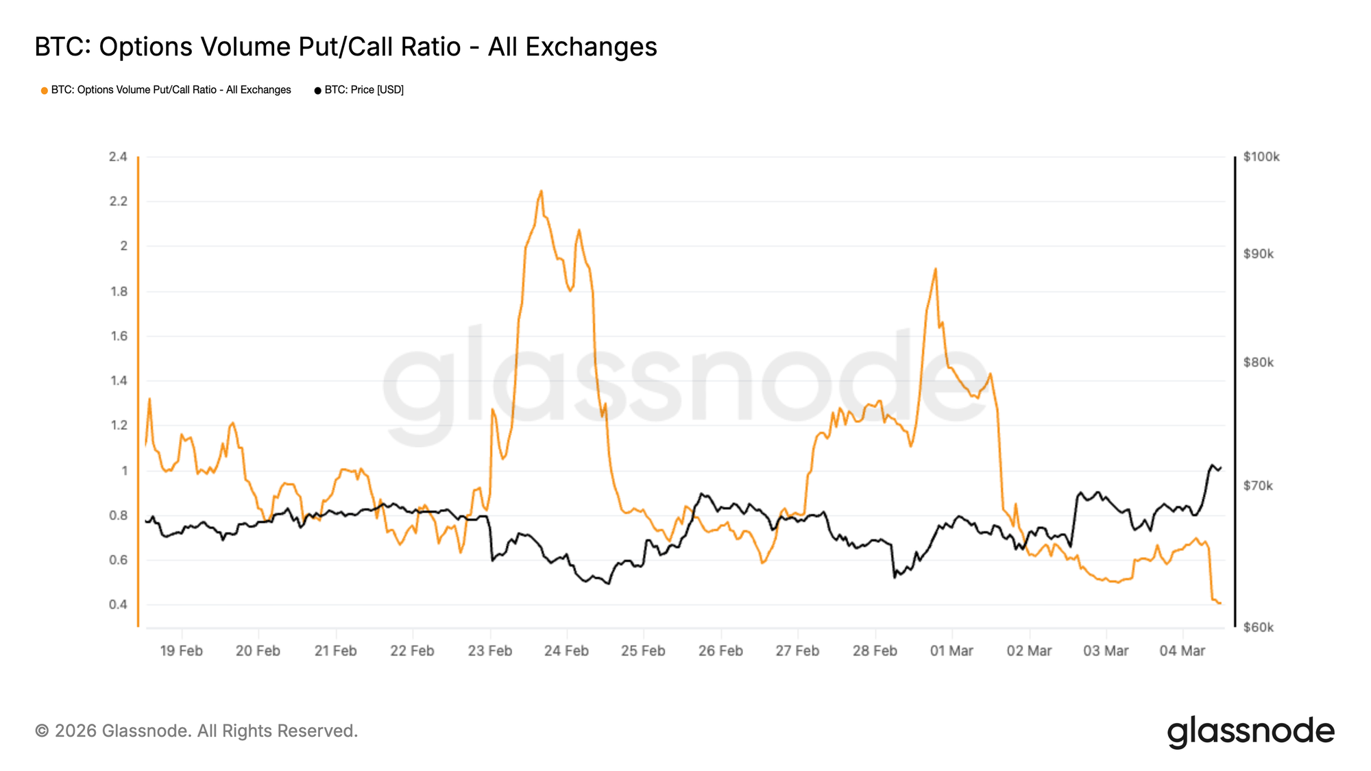 Môi trường này đã khuyến khích các nhà giao dịch xây dựng vị thế đón đầu một nhịp tăng giá chiến thuật, một sự dịch chuyển có thể thấy rõ qua tỷ lệ khối lượng Bán/Mua. Kể từ ngày 28 tháng 2, tỷ lệ này đã giảm từ mức 1,89 xuống còn 0,4, đánh dấu một sự đảo chiều đáng kể trong dòng tiền quyền chọn và làm nổi bật sự sẵn sàng ngày càng tăng của thị trường trong việc đặt cược vào cửa tăng.