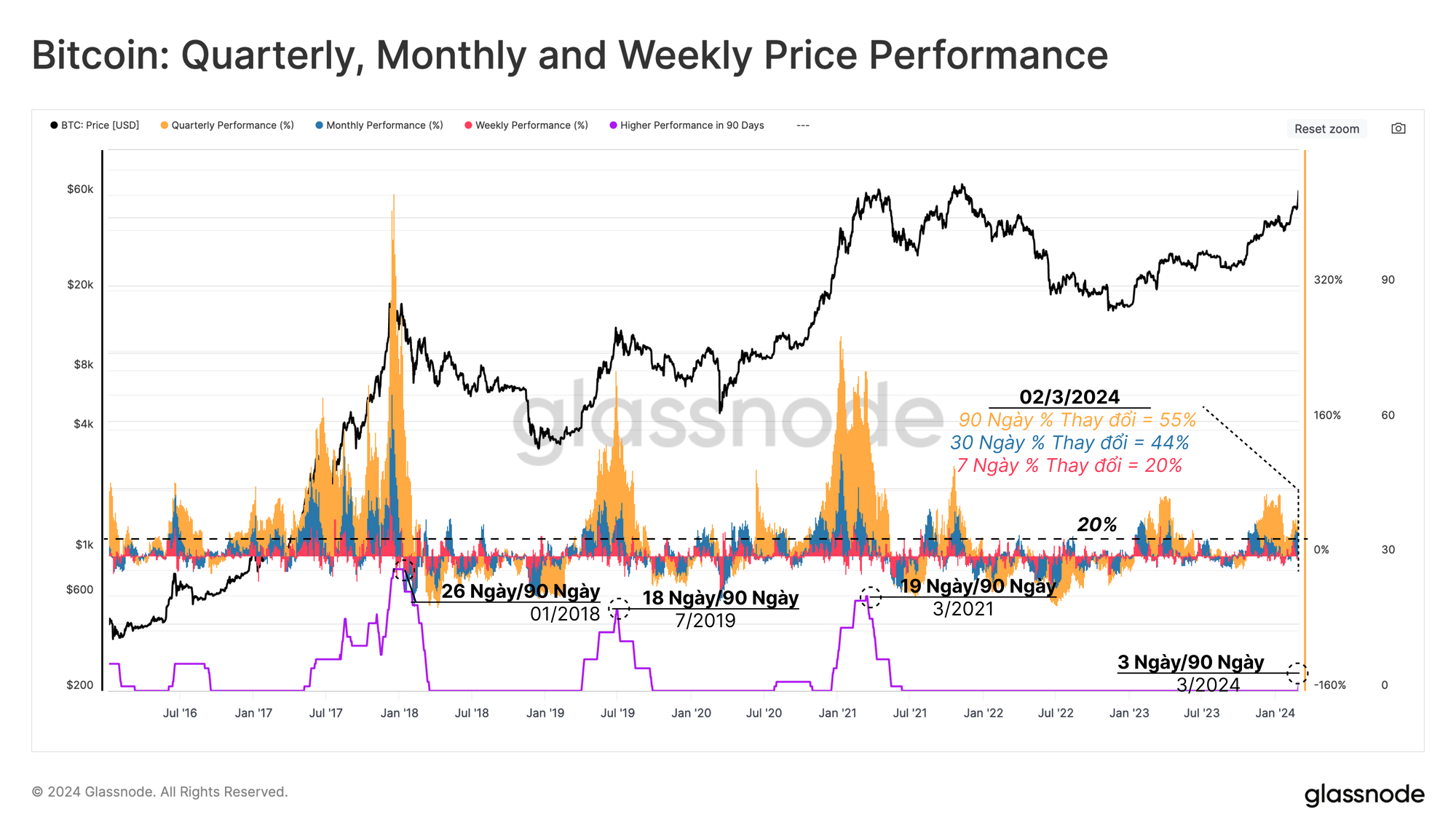 Biểu đồ bên dưới hiển thị hiệu suất luân phiên trong các khung thời gian Hàng tuần 🟥, Hàng tháng 🟦 và Hàng quý 🟧 và đã đạt +20%, +44% và +55% tại thời điểm viết bài. Nếu tính số ngày giao dịch trong quý vừa qua khi cả ba chỉ số hiệu suất đều vượt quá +20%, chúng tôi có thể thấy rằng đợt phục hồi vào cuối tuần trước là mạnh mẽ nhất kể từ thị trường tăng giá năm 2021.