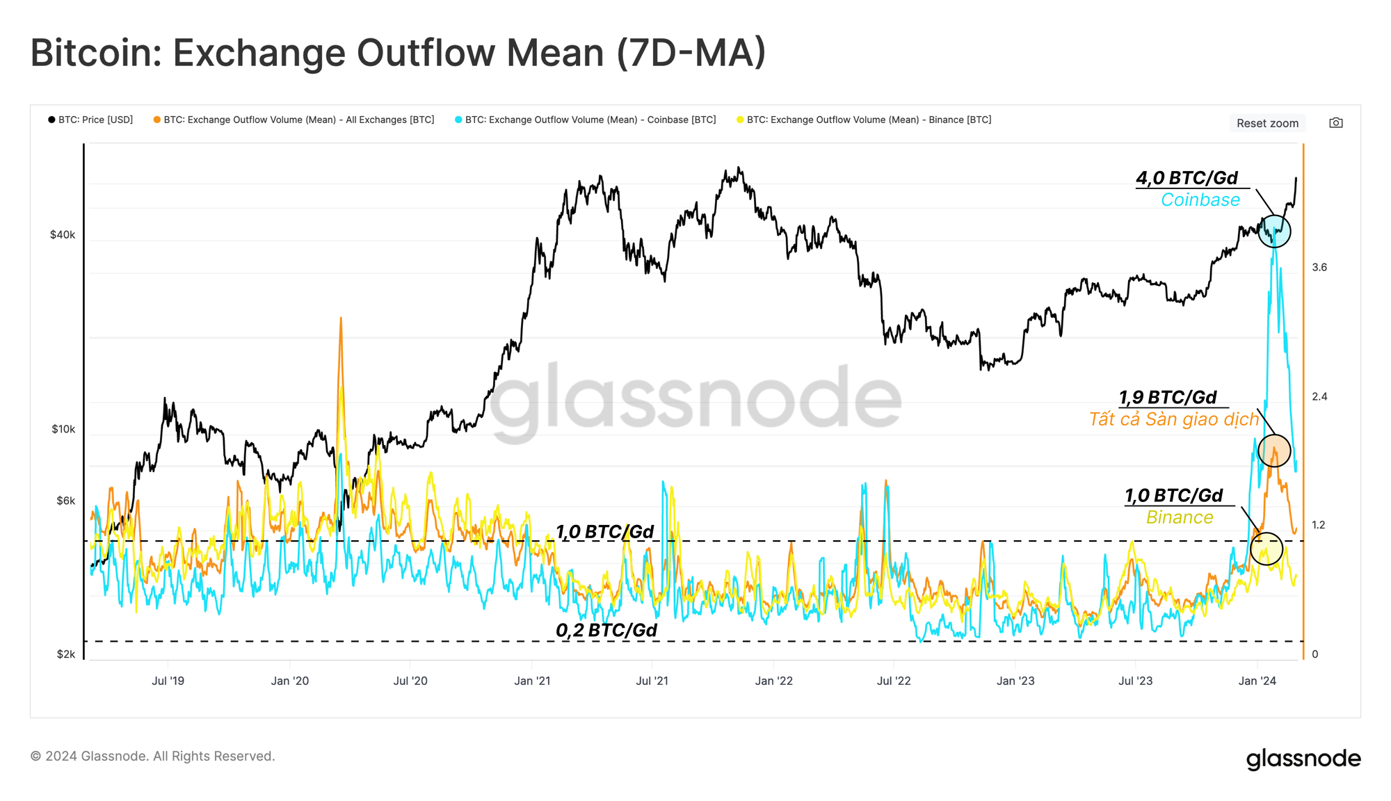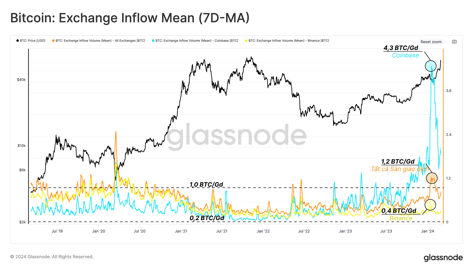 Kết quả cho thấy các giao dịch dòng vào và ra trung bình đã đạt giá trị cao hơn đáng kể, đặc biệt là đối với sàn Coinbase. Quy mô giao dịch trung bình đạt đỉnh 4,3 BTC/giao dịch tại thời điểm ETF được phê duyệt.