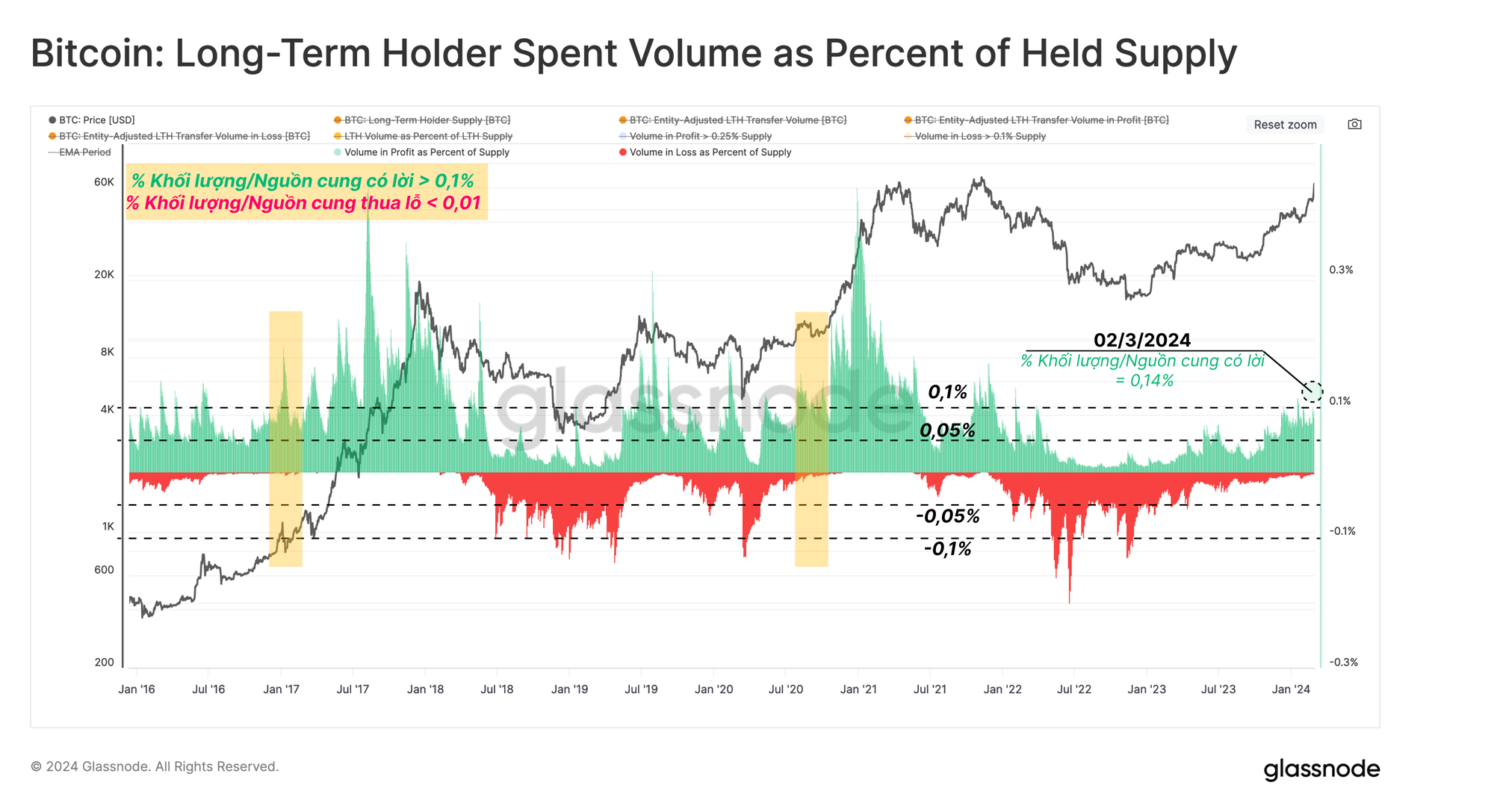 Tại thời điểm viết bài, chỉ báo này cho thấy LTH đang chốt lời với tỉ lệ bằng 0,14% tổng nguồn cung hàng ngày của họ. Số liệu này đang tiến đến các mức trùng khớp với thời kỳ đầu của giai đoạn Hưng phấn và các đợt phá vỡ ATH trước đó của thị trường.