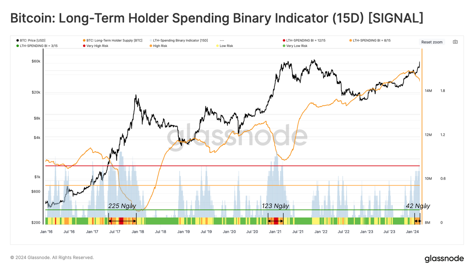 Trong biểu đồ bên dưới, chúng tôi sử dụng một số giá trị ngưỡng để phân loại các chế độ chi tiêu. Kể từ cuối tháng 1 năm 2024, thị trường đã bước vào giai đoạn mà chỉ báo nhị phân đã đánh dấu sự suy giảm nguồn cung của người nắm giữ dài hạn ít nhất 8 trong 15 ngày qua.