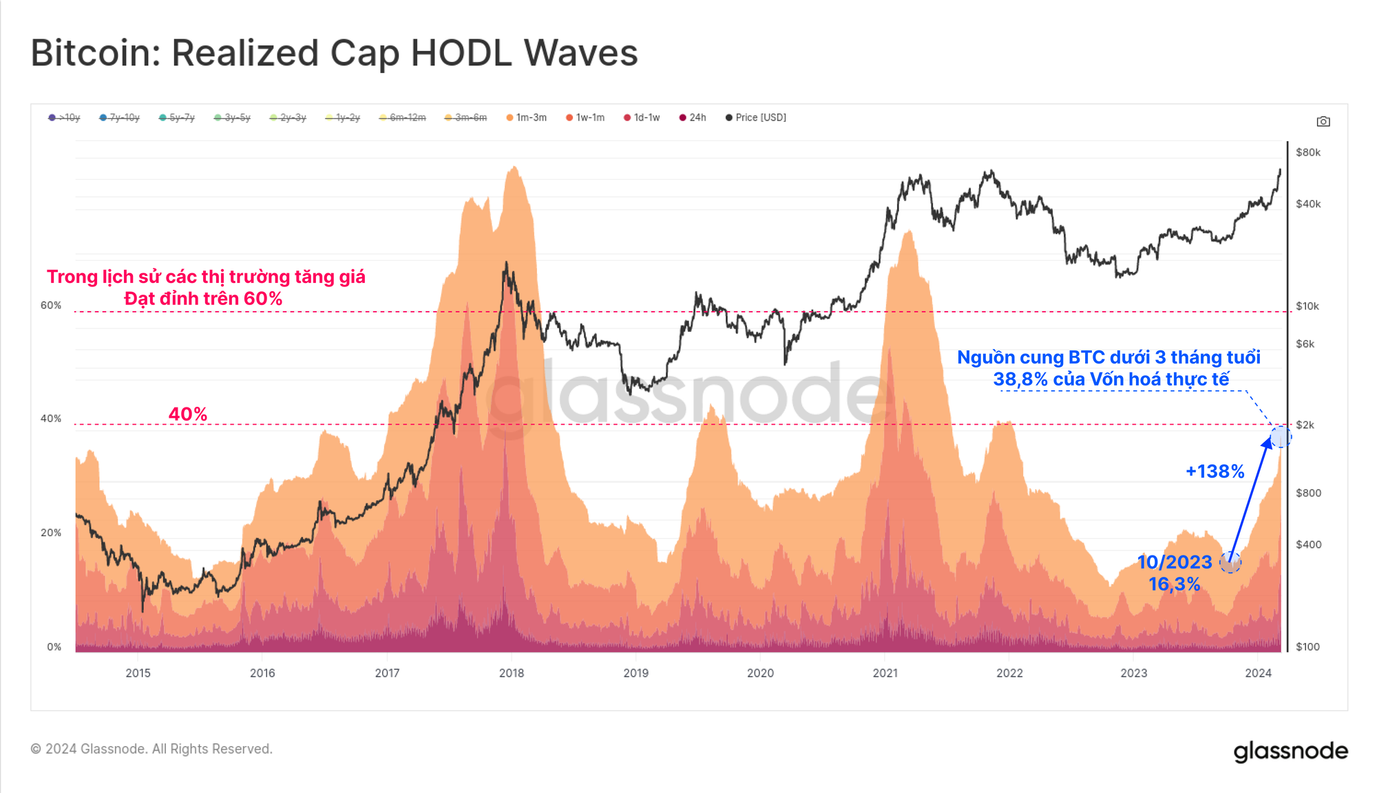 Việc chuyển giao tài sản này một lần nữa lại diễn ra, với tỷ lệ tài sản trong các “Bitcoin trẻ” (được di chuyển trong vòng 3 tháng qua), tăng 138% kể từ tháng 10 năm 2023. Điều này phản ánh chi tiêu ròng của các nhà đầu tư dài hạn những người đã giữ Bitcoin của họ trong ít nhất 3 tháng.
