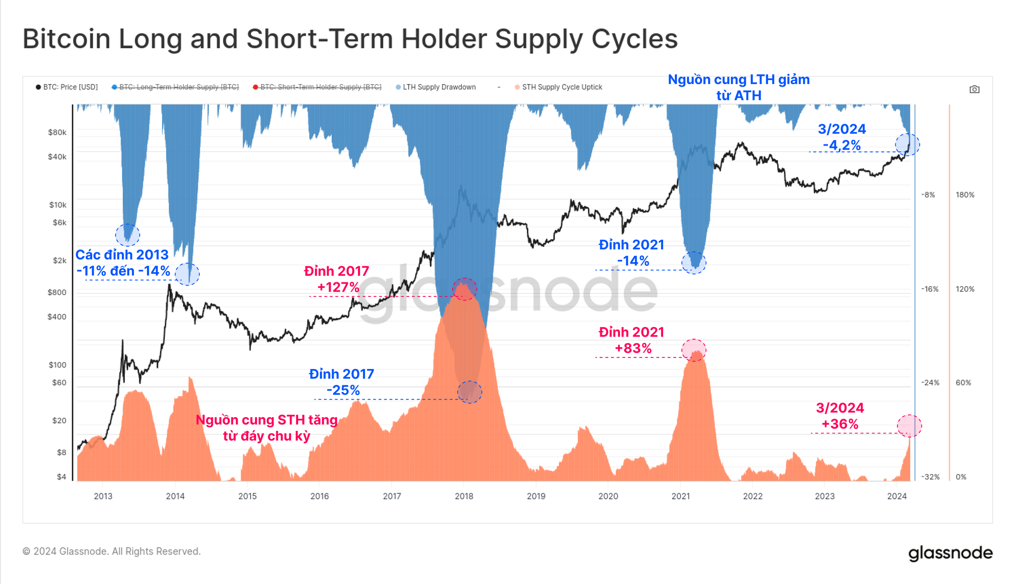 Tại các đỉnh thị trường tăng giá trước đó, Nguồn cung LTH đã giảm từ -14% đến -25%, cho thấy mức độ áp lực phân phối tương đối trong mỗi chu kỳ. Ngược lại, Nguồn cung STH có xu hướng đạt mức tối đa xung quanh đỉnh chu kỳ, tăng hơn 83% so với đáy chu kỳ.