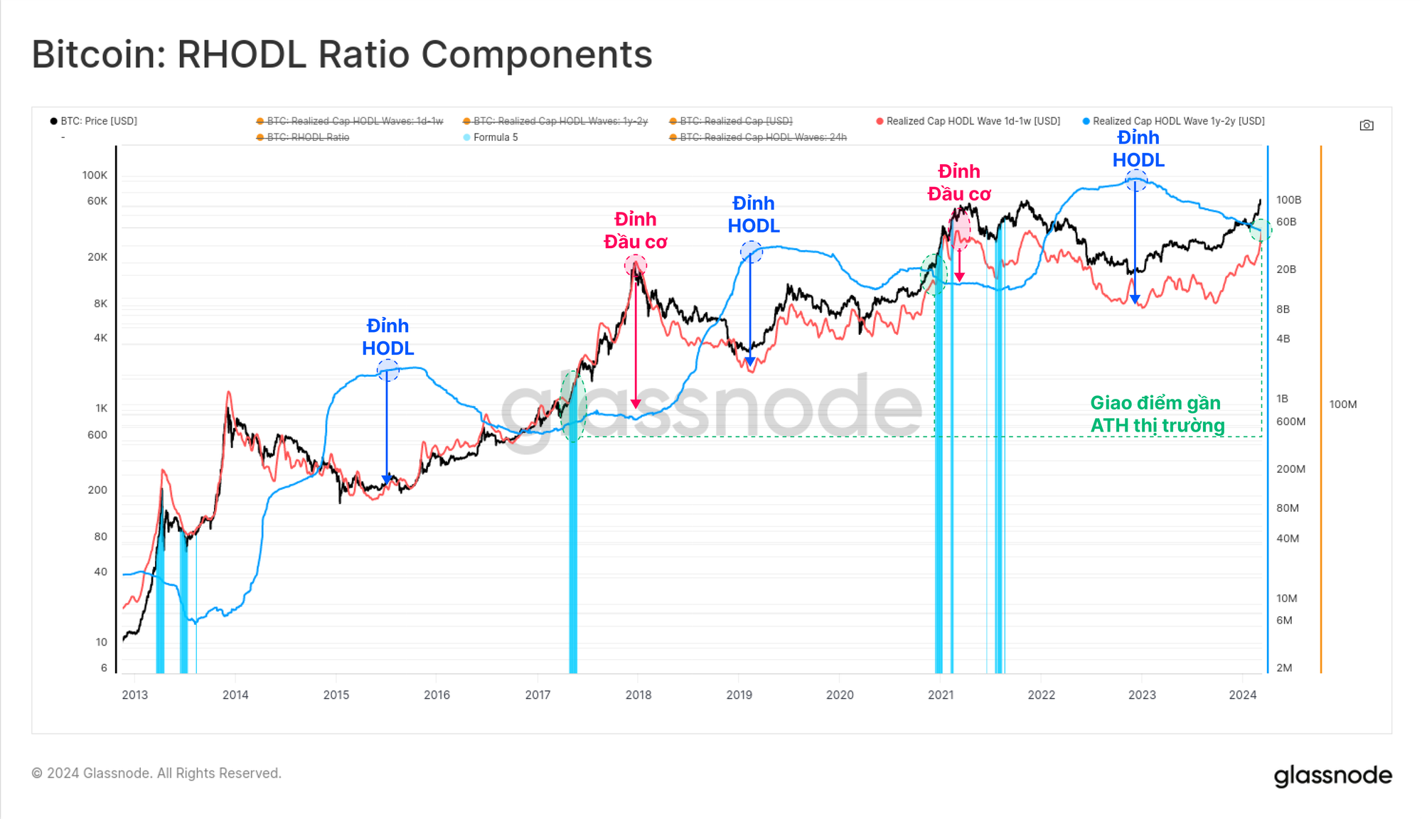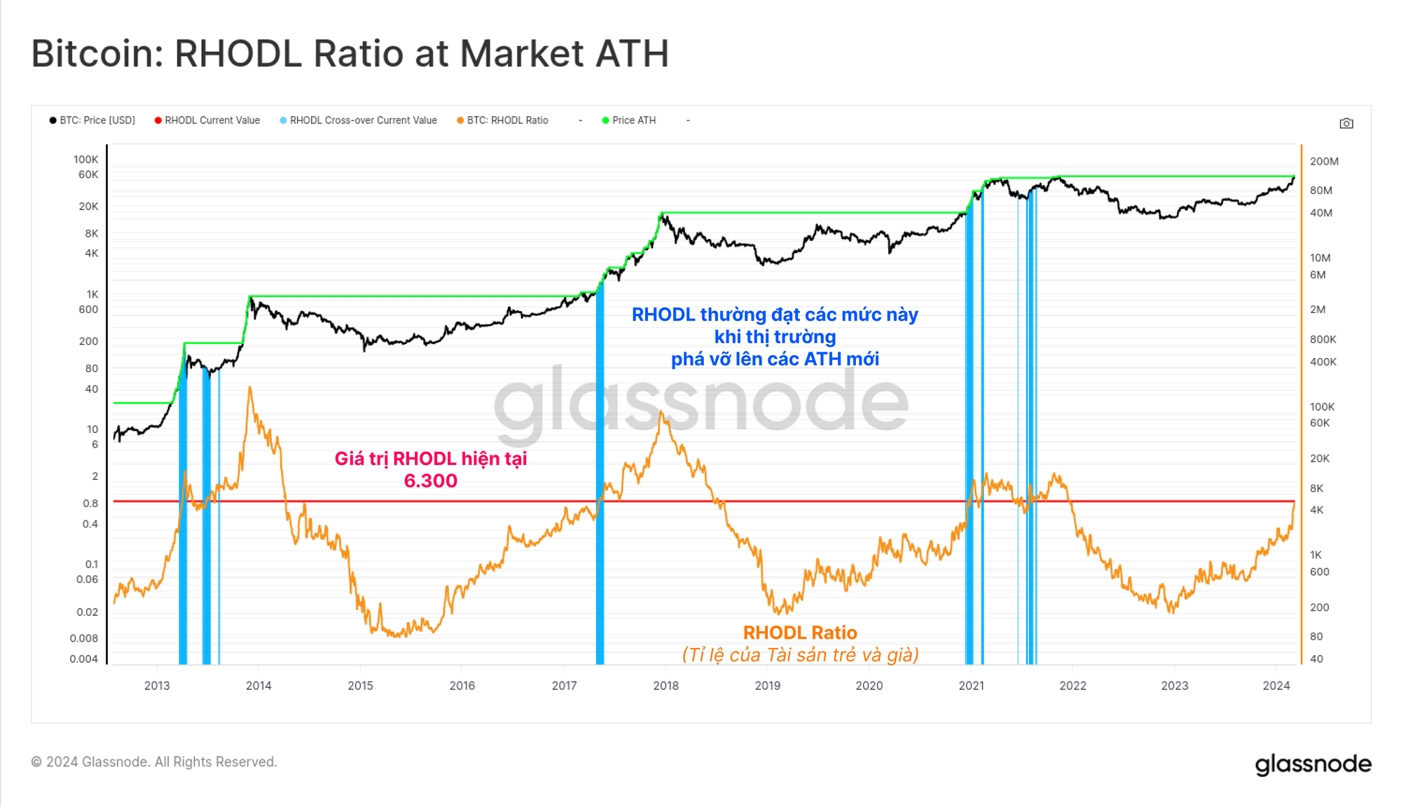 Biểu đồ bên dưới đánh dấu các vùng 🔵 trong đó RHODL Ratio vượt trên giá trị hiện tại là 6.300. Có thể thấy rằng chỉ báo này ở vị trí rất giống với tất cả các lần phá vỡ ATH trước đó, cho thấy việc chuyển giao tài sản tương tự với các tiền lệ lịch sử.
