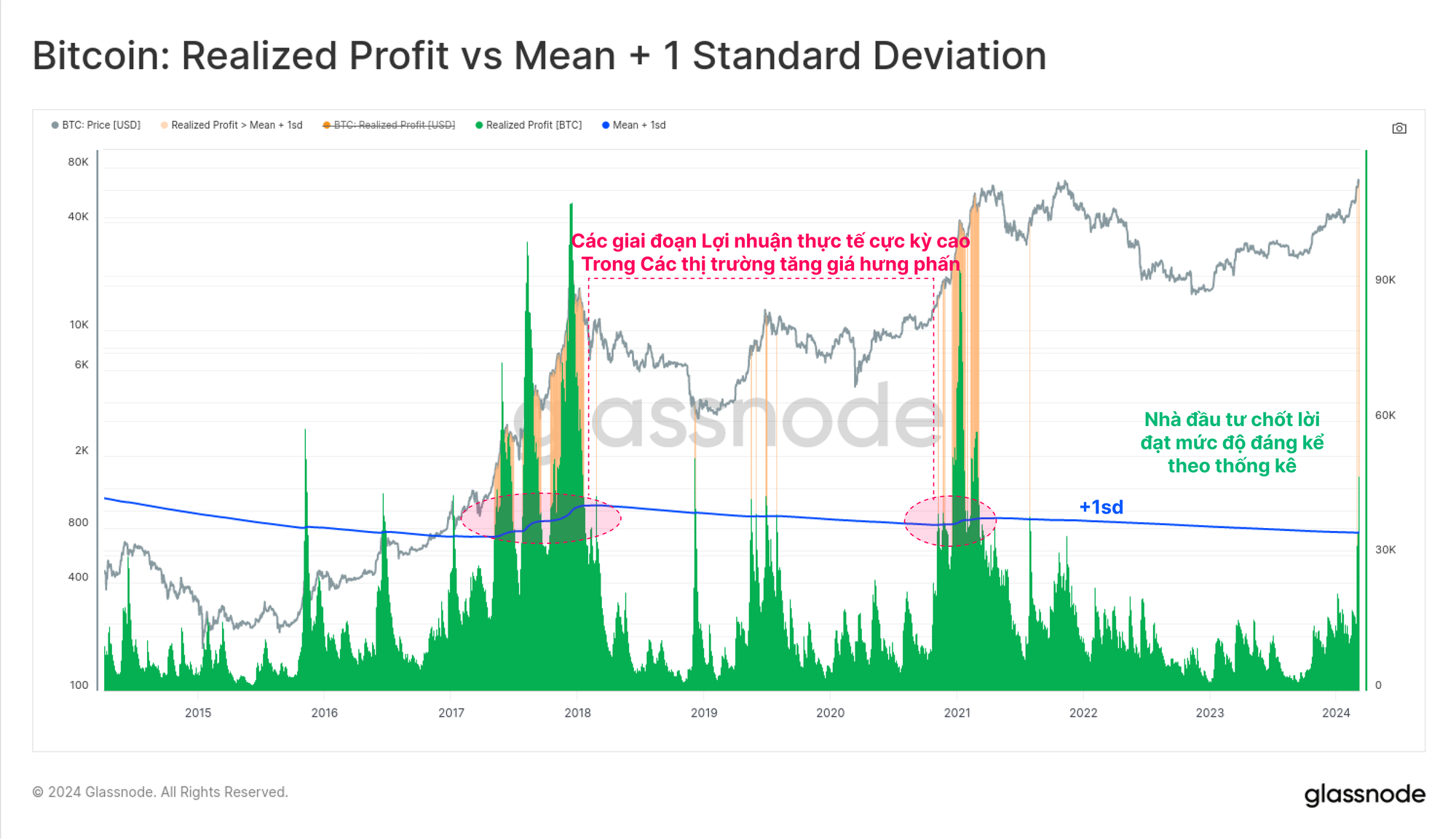Do đó, chúng tôi có thể liên hệ dòng vốn vào với sự gia tăng trong vốn hoá thực tế và chỉ số Lợi nhuận thực tế. Tuần này, mức độ Lợi nhuận thực tế trong các chi tiêu on-chain đã đạt mức cao về mặt thống kê, giao dịch nhiều hơn độ lệch chuẩn 1 trên mức trung bình dài hạn của nó.