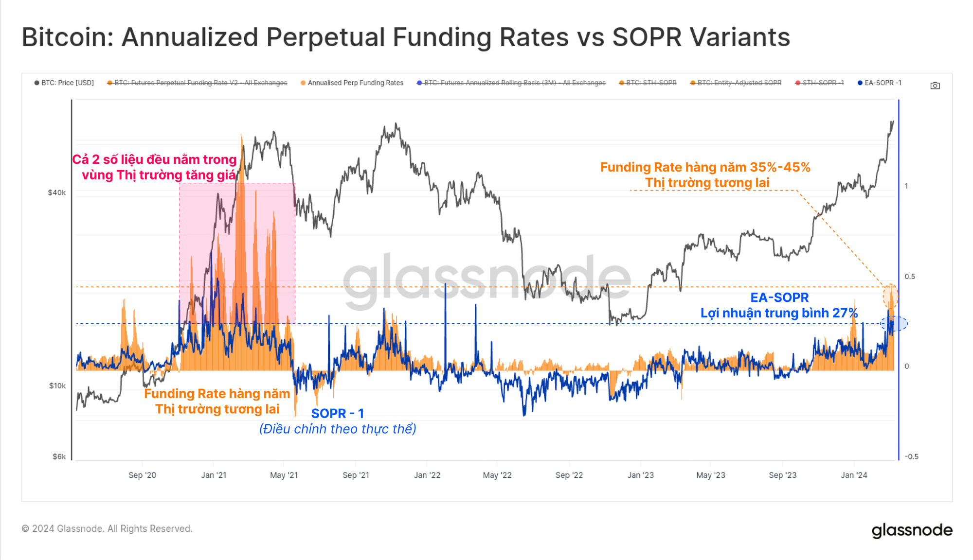 - 🟠 Funding rate thị trường tương lai (Hàng năm), phản ánh lãi suất được trả từ vị thế mua cho vị thế bán (khi có giá trị dương và ngược lại là giá trị âm). Funding rate giúp đo lường mức độ và hướng đòn bẩy trong thị trường tương lai, cũng như khuyến khích các nhà tạo lập thị trường thêm tính thanh khoản vào sổ lệnh để giao dịch chênh lệch phí bảo hiểm (thông qua giao dịch cash-and-carry).