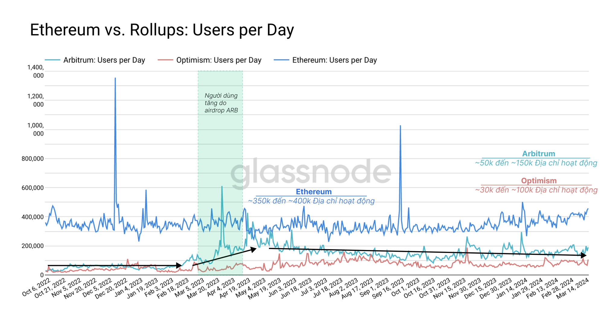 Các giải pháp roll-up đã trở nên phổ biến trong 2 năm qua, với hai giải pháp mở rộng quy mô chính là Arbitrum và Optimism, chứng kiến mức sử dụng tăng lần lượt lên tới 150k và 100k địa chỉ hoạt động hàng ngày. Trong khi đó, mạng chính của Ethereum vẫn có số lượng hoạt động lớn nhất, với hơn 400k địa chỉ hoạt động mỗi ngày.