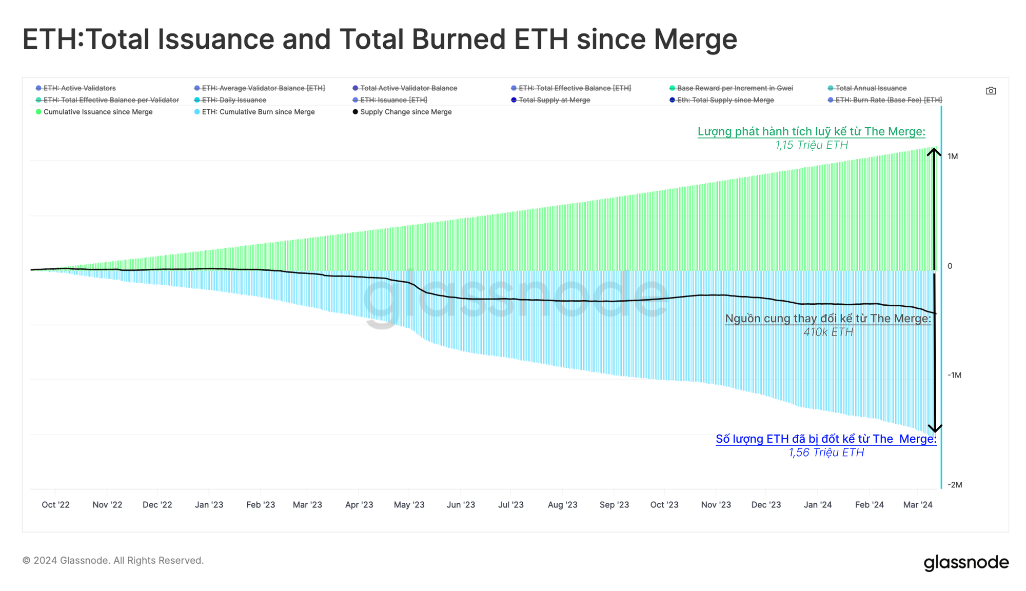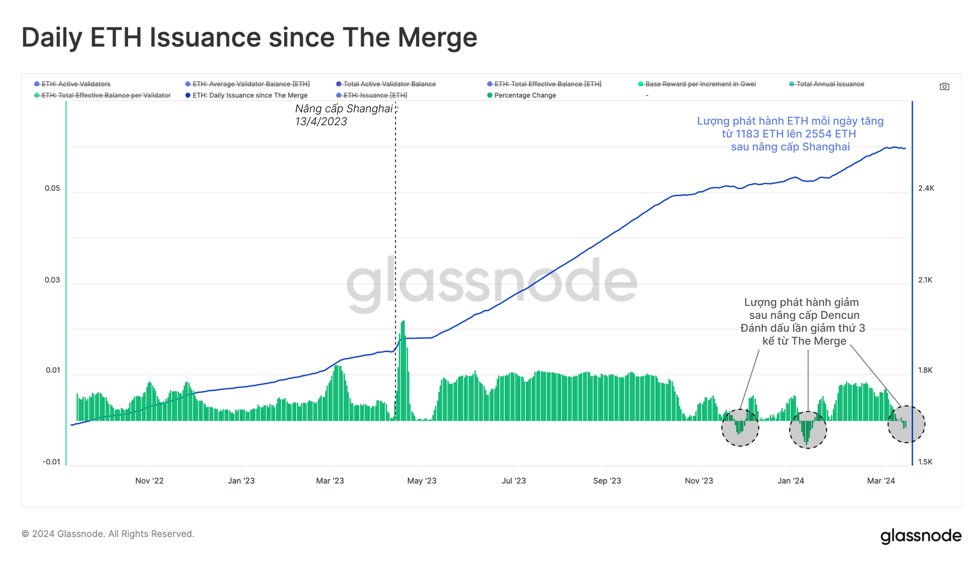 Kể từ nâng cấp Shanghai, số lượng phát hành đã tăng từ 1183 ETH/ngày lên 2554 ETH/ngày khi số lượng validitor tăng lên. Sau nâng cấp Dencun, chúng tôi nhận thấy tỉ lệ phát hành đã giảm đến lần thứ ba.