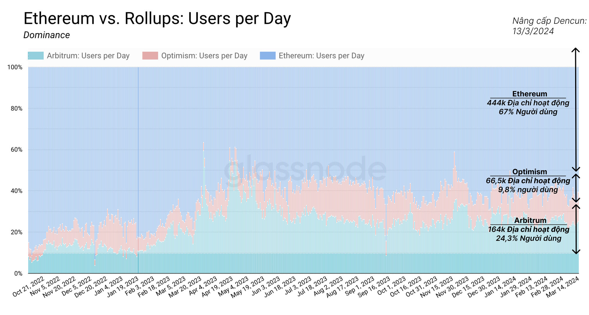 Vào thứ Tư, ngày 13 tháng 3, Ethereum đã trải qua một bản cập nhật lớn khác. Bản nâng cấp Cancun-Deneb (Dencun) mang đến những thay đổi đáng kể cho cơ sở hạ tầng rollup của Ethereum. Bản nâng cấp cũng thực hiện một số sửa đổi đối với pool staking của Ethereum để cải thiện giao tiếp node và độ ổn định của mạng.
