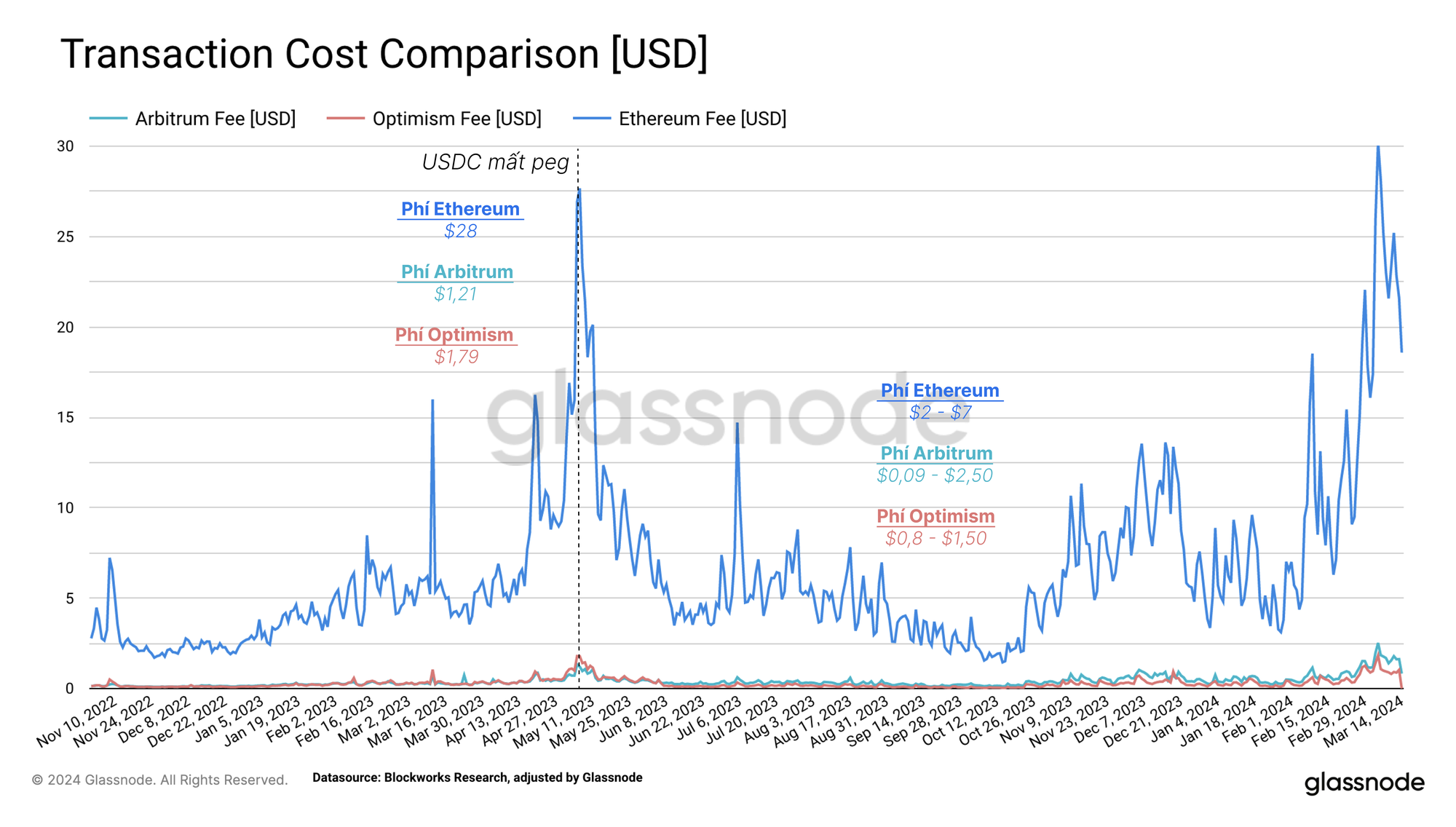Việc chuẩn hóa thành USD cho phép chúng tôi hiểu phí roll-up hoạt động khác nhau như thế nào so với phí mạng chính. Kể từ khi thành lập, các roll-up đã đưa ra mức phí rẻ hơn và ít biến động hơn, dao động từ 0,10 USD đến 0,30 USD cho mỗi giao dịch đối với Arbitrum và Optimism. Ngược lại, phí chuỗi chính Ethereum dao động từ 2 USD đến 7 USD trong cùng thời gian.