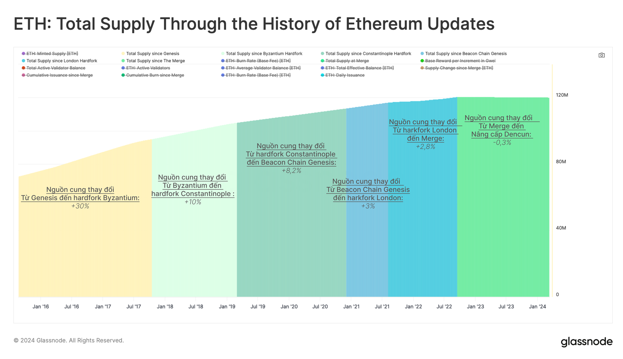 Trong suốt lịch sử của mình, Ethereum đã trải qua sáu lần cập nhật lớn và không phải tất cả đều trực tiếp nhắm đến mục tiêu thay đổi nguồn cung ETH. Tuy nhiên, rõ ràng là bốn lần nâng cấp gần đây nhất cho thấy tốc độ tăng trưởng của nguồn cung ETH đã chậm lại. Sau The Merge, nó thậm chí còn chuyển sang giá trị âm. Biểu đồ bên dưới hiển thị các sự kiện nâng cấp khác nhau cùng với sự thay đổi tương đối trong nguồn cung ETH đang lưu hành.
