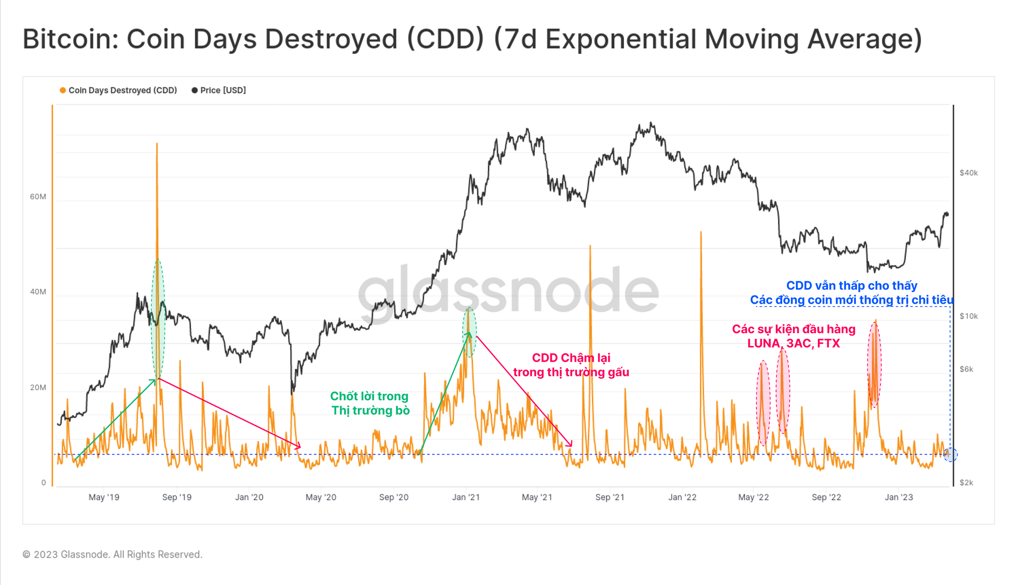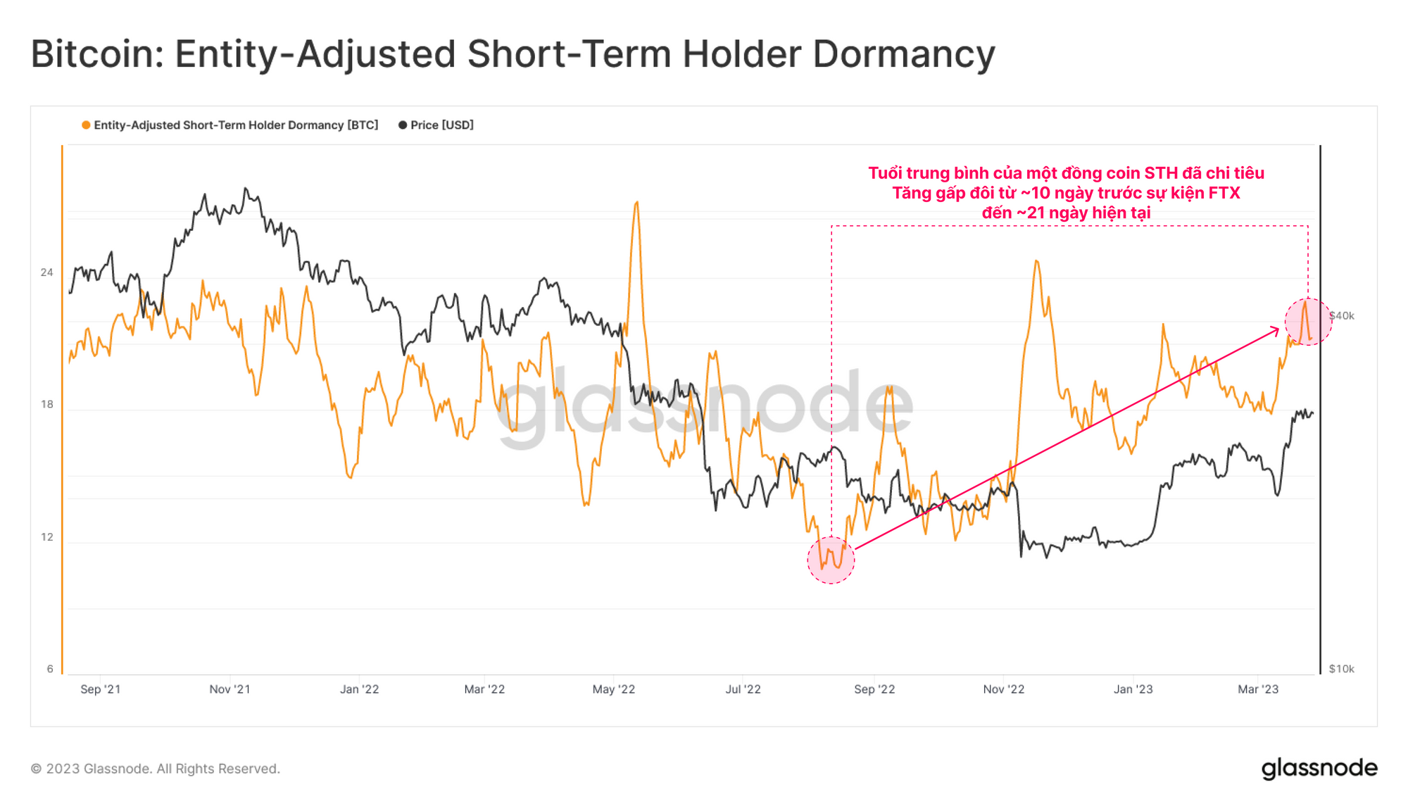 Phân tích những Người nắm giữ ngắn hạn, tuổi trung bình của một đồng coin STH đã chi tiêu cũng đã tăng gấp đôi một cách hiệu quả từ ~10 ngày trong những tháng trước thời điểm FTX phá sản, lên đến 21 ngày hiện tại. Điều này bổ sung thêm bằng chứng cho lập luận rằng nhóm Người nắm giữ ngắn hạn, những người đã tích lũy BTC gần mức thấp trong chu kỳ, là những người tham gia chính trong việc chốt lời gần đây.