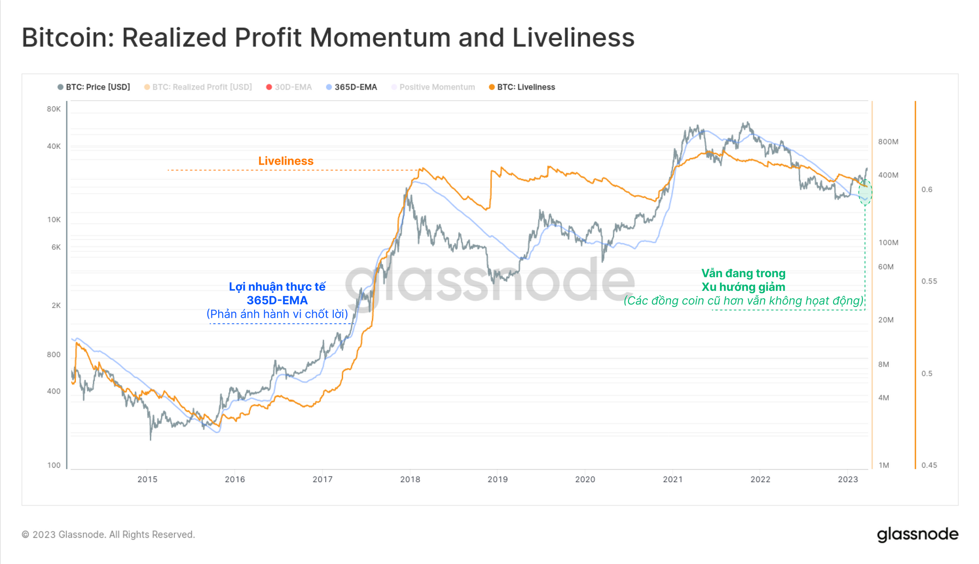 - Liveliness sẽ có xu hướng giảm khi thị trường ưu tiên tích lũy và HODL, tuổi thọ đồng coin ngày càng tăng và thể hiện niềm tin vào tài sản.