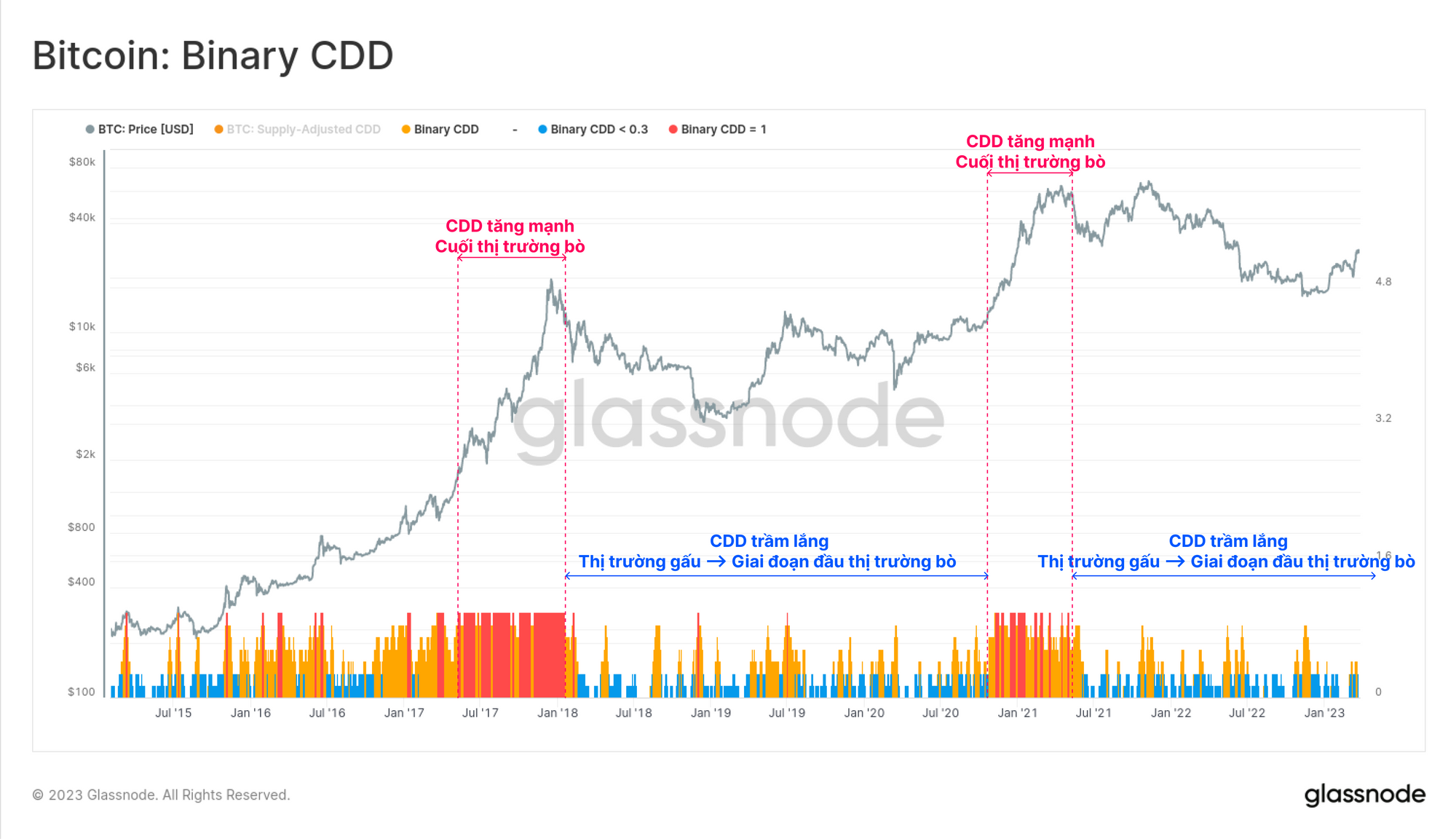Từ quan điểm này, việc chốt lời của những người nắm giữ dài hạn trong thị trường bò trở nên cực kỳ rõ ràng, được đánh dấu bằng các khoảng thời gian màu đỏ và màu cam kéo dài liên tục. Tuy nhiên, chúng tôi cho rằng thị trường hiện tại vẫn đang trong khoảng thời gian yên tĩnh điển hình của các thị trường giá giảm, giai đoạn đầu của thị trường bò và là giai đoạn chuyển tiếp ở giữa.