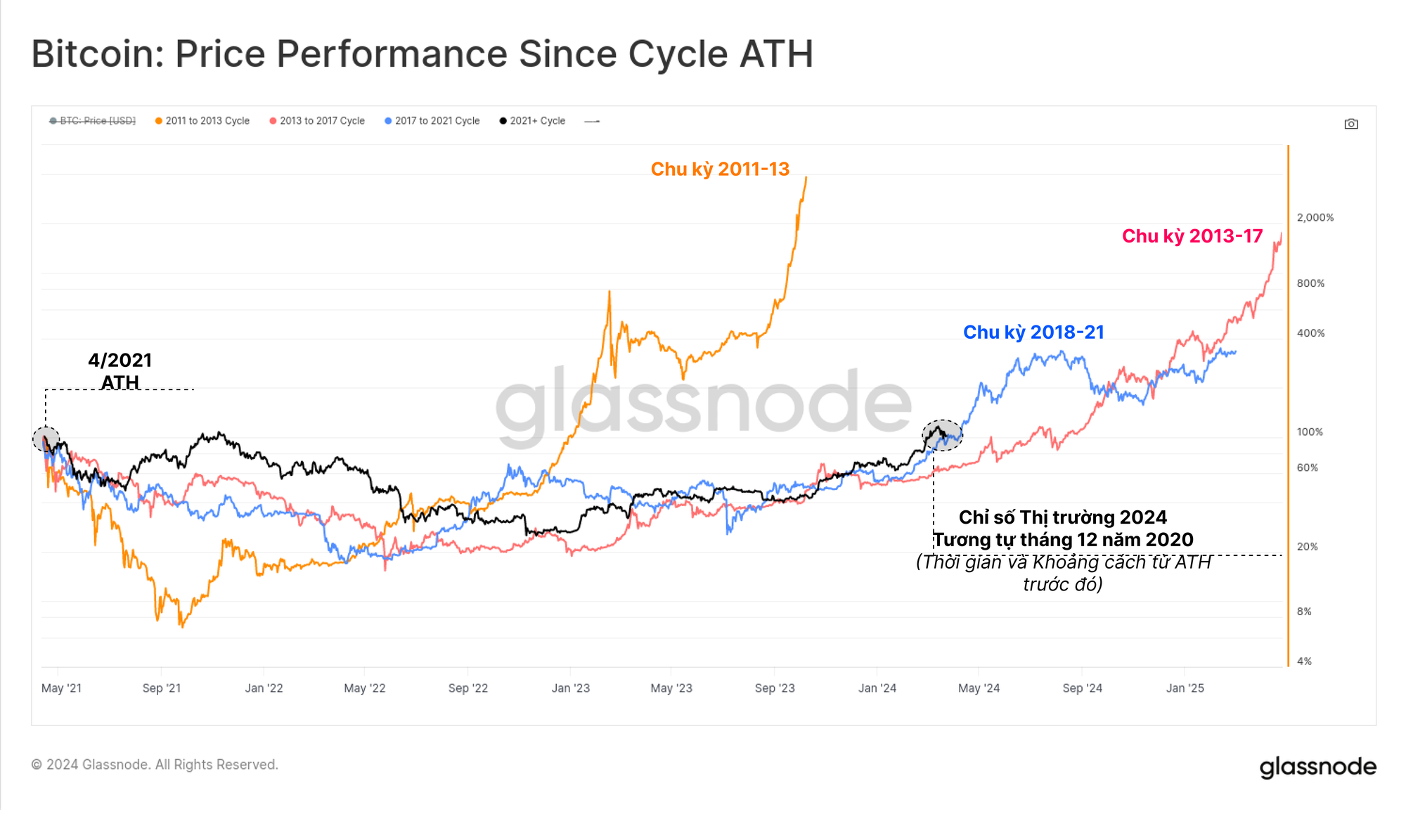 Nếu lập chỉ số hiệu suất giá (màu đen) kể từ ATH tháng 4 năm 2021 (thời điểm chúng tôi cho rằng tâm lý thị trường giá xuống đã hình thành), chúng ta có thể thấy sự tương đồng đáng chú ý với chu kỳ trước đó (màu xanh lam). Xét cả về thời gian và khoảng cách từ mức đỉnh tháng 4 năm 2021, thị trường đang ở vị trí gần như giống hệt với tháng 12 năm 2020 trong chu kỳ 2018-21.